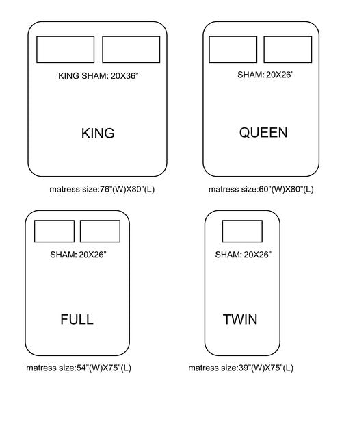 - One twin comforter: 68"x86"; One full/queen comforter: 90"x90"; One king comforter: 102"x90".
