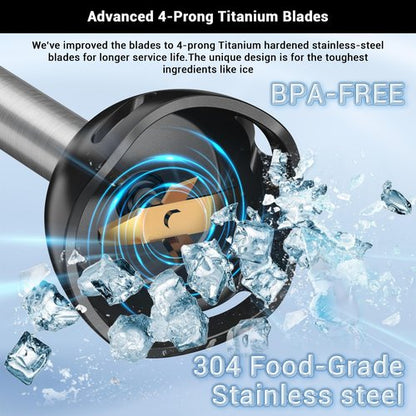 - Experience Consistent Smooth Results: Elevate your smoothie game with our immersion blender featuring unique 4-prong Titanium steel blades and a powerful 1000-watt motor. Designed with a curve design, our blades effortlessly blend hard ingredients, including ice cubes and frozen fruits, ensuring consistently smooth results every time.