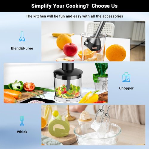 - Complete Kitchen Accessories Included: Your package comes with a snap-on Blending attachment, a twist-and-lock Chopper featuring a removable blade, and a pair of Egg Beaters. The versatile chopper doubles as a mini food processor, ensuring your kitchen tasks are both enjoyable and effortless with all the essential accessories included.