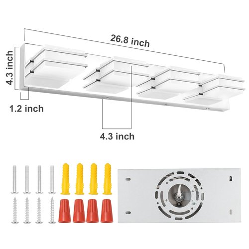 - ใ๐๐ฉ๐๐๐ข๐๐ข๐๐๐ญ๐ข๐จ๐ง๐ฌใBackplate Size: 26.8" (L) x 4.3" (W) x 1.2" (H) โค Distance From Wall: 4.3" โค Material: Acrylic + SUS304 Stainless Steel โค Color Temperature: 3000K/4000K/6000K โค Dimmable: Yes โค Wattage: 24W โค Lumen: 1920LM โค Input: 120 V (AC), 60Hz โค CRI: >85 โค Light Source: 2835SMD LED Chips โค Light Direction: Adjustable
