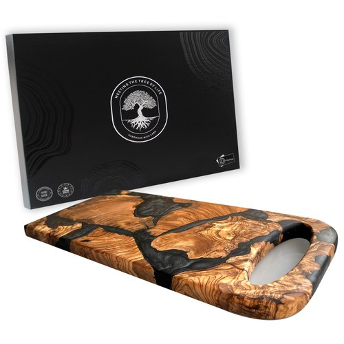 - EPOXY RESIN CHARCUTERIE BOARD: Nature meets art in these exquisitely carved cool mini charcuterie boards small. Olive wood cheese board has been enriched with a beauty of resin design by applying white color river strip. Our epoxy small cutting board wood serving board sushi platter and boarderie arte cheese and cute charcuterie board are handmade from sustainably sourced olivewood and accented with resin by using traditional methods.
