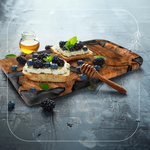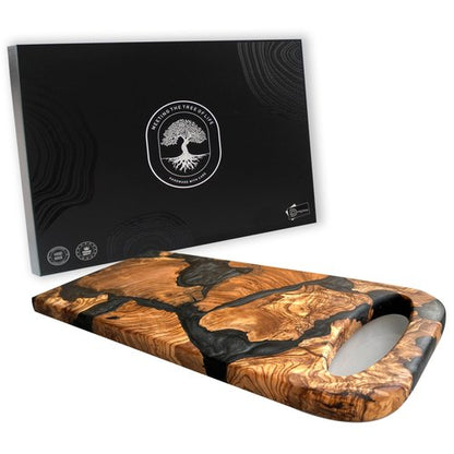 - HANDCRAFTED OLIVE WOOD CUTTING BOARD: Decorative wooden small charcuterie board with handle wooden serving trays for entertaining has been carefully handcrafted from natural olive wood board for charcuterie. Our art resin small wood cutting boards for kitchen are offered in an artisan-inspired rustic shape. Handmade cutting boards wood products are easy to care for. This mini cutting board wood resin for cheese and wine has a dense grain and can last not only for your lifetime but for generations.
