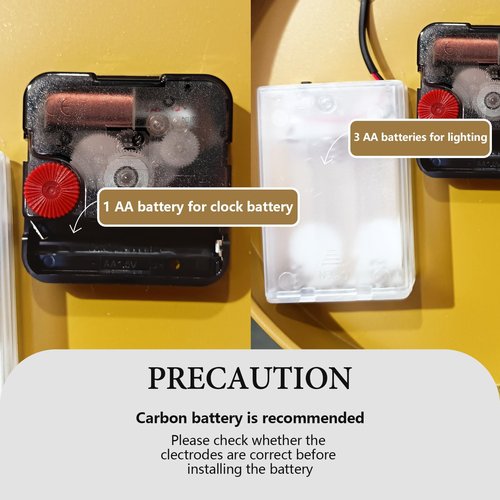 - 【Accurate and Quiet】- The silent non ticking decorative wall clock precise quartz sweep movement ensures accurate time and no any loud annoying ticking sounds,helping you enjoy peaceful sleep as time goes by.Requires 1 AA carbon batteries and 3 AA batteries for lighting(not included)