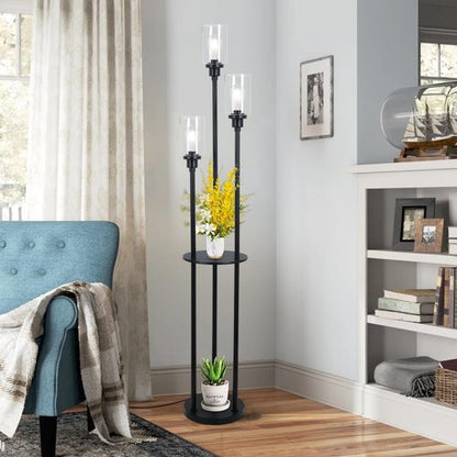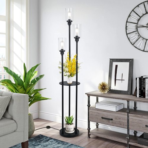 HMVPL Floor Lamps for Living Room, 3-Lights Modern Floor Lamp with Shelves, Farmhouse Standing Lamp with Glass Shades, On/Off Foot Switch, Black Industrial Tall Lamp for Bedroom Office Corner(66")