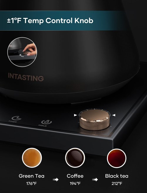INTASTING Electric Kettles, Gooseneck Electric Kettle, ±1℉ Temperature Control, Stainless Steel Inner, Quick Heating, for Pour Over Coffee, Brew Tea, Boil Hot Water, 0.9L Black