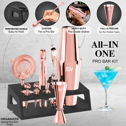 IOV Cocktail Shaker Set: 12-Piece Mixology Bartender Kit Bar Set | 18oz & 28oz Boston Shaker Drink Mixing Tools for Home with Recipe Booklet and Stand | Fun Housewarming Gift (Rose Gold)