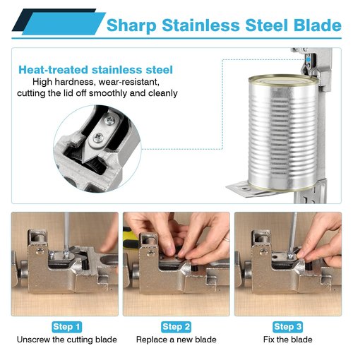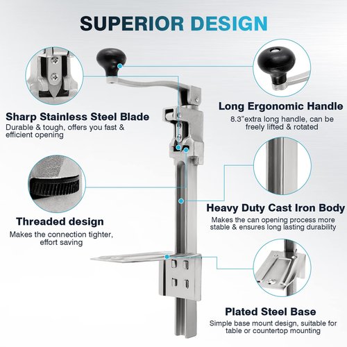 - 【Excellent Stability】This tabletop can opener comes with a plated steel base and screws which can be fixed firmly on any table or countertop, makes the can opening process more stable and safe. The base can be disassembled for storage.