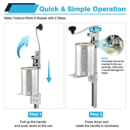 - 【Wide Application】This manual can opener can open cans easily and quickly without long and tedious steps. Put in the jar, put down and rotate the handle, then open the delicious jar. This rust proof can opener commercial is designed to handle the industrial sized cans that most restaurants buy and is perfect for cutting down time on food processing, Ideal for a fast paced commercial environment such as hotels, restaurants, bars, food store.