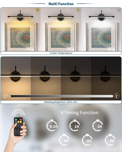 - Dimmable Function Wireless Wall Light :The battery operated picture light with remote control to change wall accents scones lighting brightness (20%-100%) according to your needs.