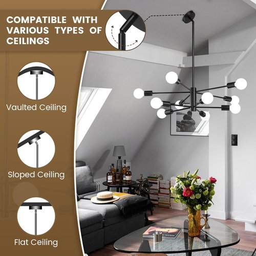 - Fit Sloped Ceilings - This sputnik chandelier with a durable swivel could be mounted on flat, vaulted or angled ceilings. Attention: Before installing this modern ceiling light fixture, please make sure the height is set and the base is fixed in a firm place (safety first).