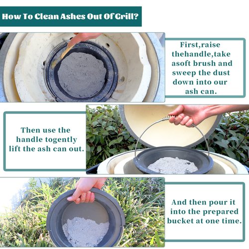 - 【How To Clean Ashes Out Of Grill】- After a cook,When the coals are cool,you can lift the basket and shake it over your ash bucket.There may be a dusting of ash left on the ceramic sides of the firebox.You just take a soft brush and sweep the dust down into our movable ash can.Then gently lift the ash can out,and then pour it into the prepared charcoal ash bin at one time.The whole process takes much less than two minutes.Now goes back into the firebox and is ready to go for the next cook.