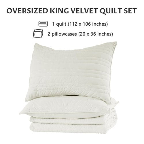 - OVERSIZED KING SIZE QUILT SET INCLUDES: velvet coverlet 3 piece set includes 1 velvet quilt bedding112 x 106 inches 2 pillowcases 20 x 36 inches bedding comes in a variety of colors to suit different decisions