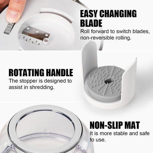 - One-Wheel Blade Selector: Innovative unidirectional wheeln of the zucchini spiralizer seamlessly cycles through 3 blades without disassembly. Simply rotate the textured dial (clockwise only) to click between 0.2" fine shredding, 0.3" shredding, and 1.4" flat cuts. Safety lock prevents accidental blade changes during use.