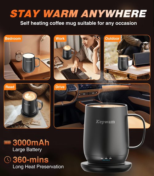 • What's Included: 16 ounces Kepwam heated coffee mug; charging coaster and power adapter; removable lid; Note: The self heating coffee mug can only be washed by hand. Do not put it in the dishwasher