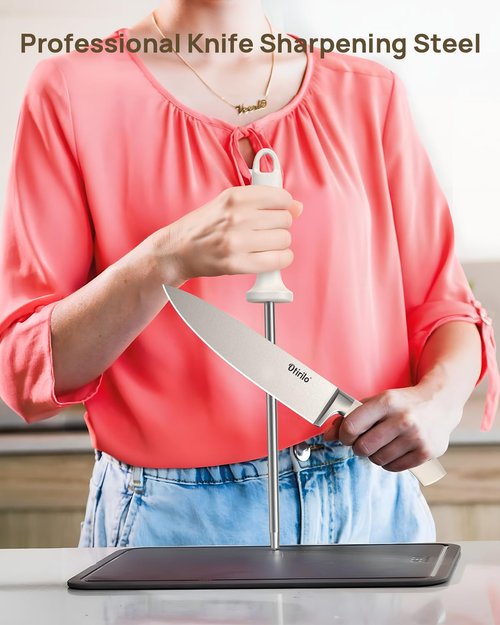 - All in One Chef Knife Sets - 15 pieces cutting knife set includes: 8" Chef knife, 8" Slicing knife, 7" Santoku knife, 8" Serrated bread knife, 5" Utility knife, 3.5" Paring knife, 5 Pcs 4.5" serrated steak knife, 1 Pc kitchen shear, 1 Pc Knife Sharpener steel and hard wood Knife Block. Otirilo kitchen knife sets includes all cooking knife set for multipurpose, it is the perfect home decor gift, and also suitable for Monther's Day gift, Father's Day gift, Weddings, Birthday, Housewarming, Thanksgiving, and Christmas.