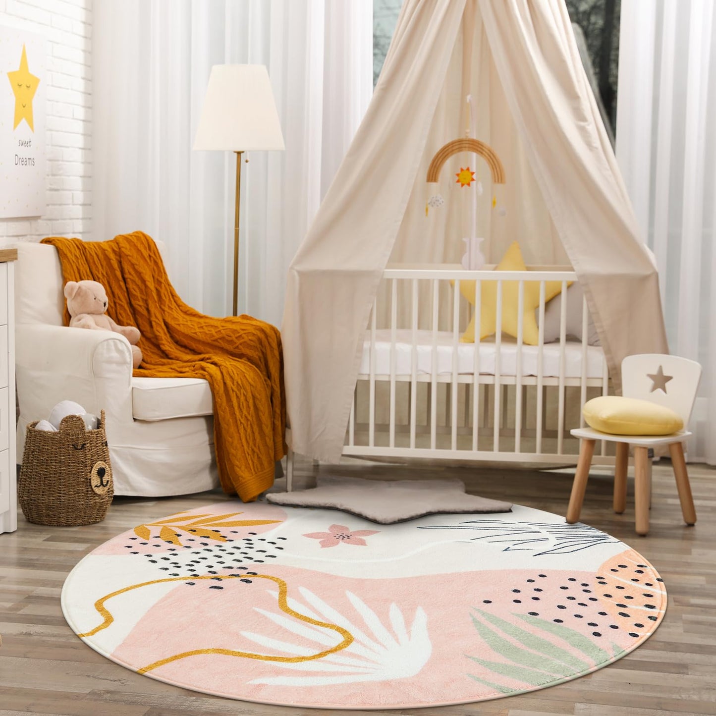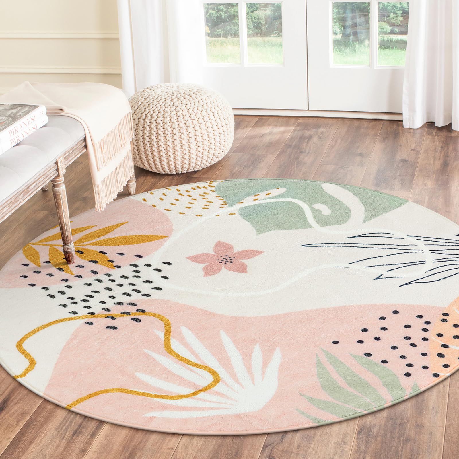 Lahome Pink 6' Round Area Rug, Non-Slip Soft Ultra-Thin Washable Floral Boho Rugs for Living Room, Dining Room, Bedroom, Entryway, Office Dorm, Lightweight