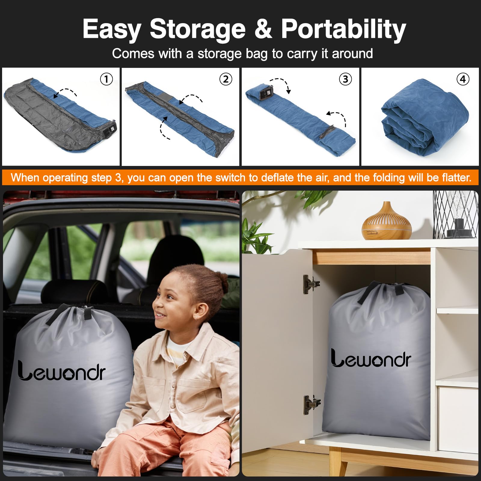 - Easy to Carry: Lightweight and space-saving, foldable inflatable bed comes with a storage bag for easy transportation and storage at home, in the car or garage. (Storage size: 27'' x 22'') The 4 three-dimensional corners exude a sense of stylishness. The mattress has side pockets and suitable for storing small items, such as phones, remote controls and etc.