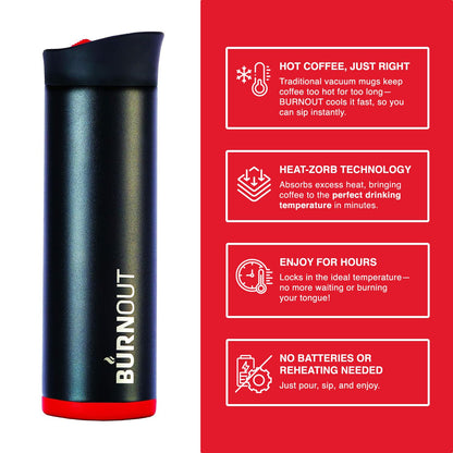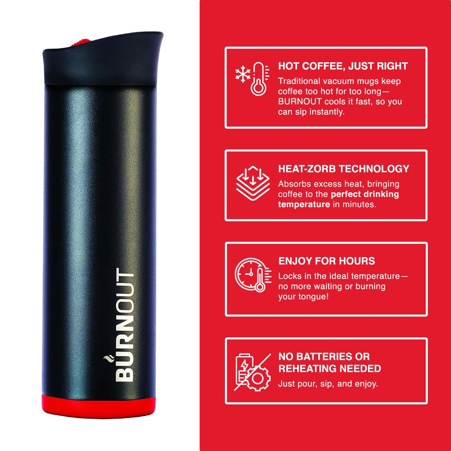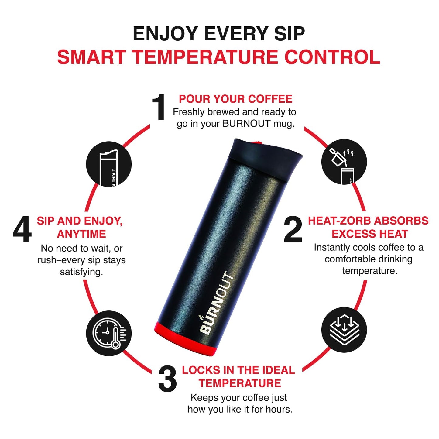 - Temperature Control for Every Sip – The Burnout Temperature-Regulating Travel Mug is designed to cool freshly brewed coffee to an optimal drinking temperature within minutes and maintain that warmth for hours. No waiting or discomfort—just smooth, enjoyable sips. Developed by aerospace engineers, Burnout uses Heat-Zorb technology to absorb excess heat, bringing your drink to 145°F before gradually releasing stored warmth. No batteries, no charging—just smart engineering.