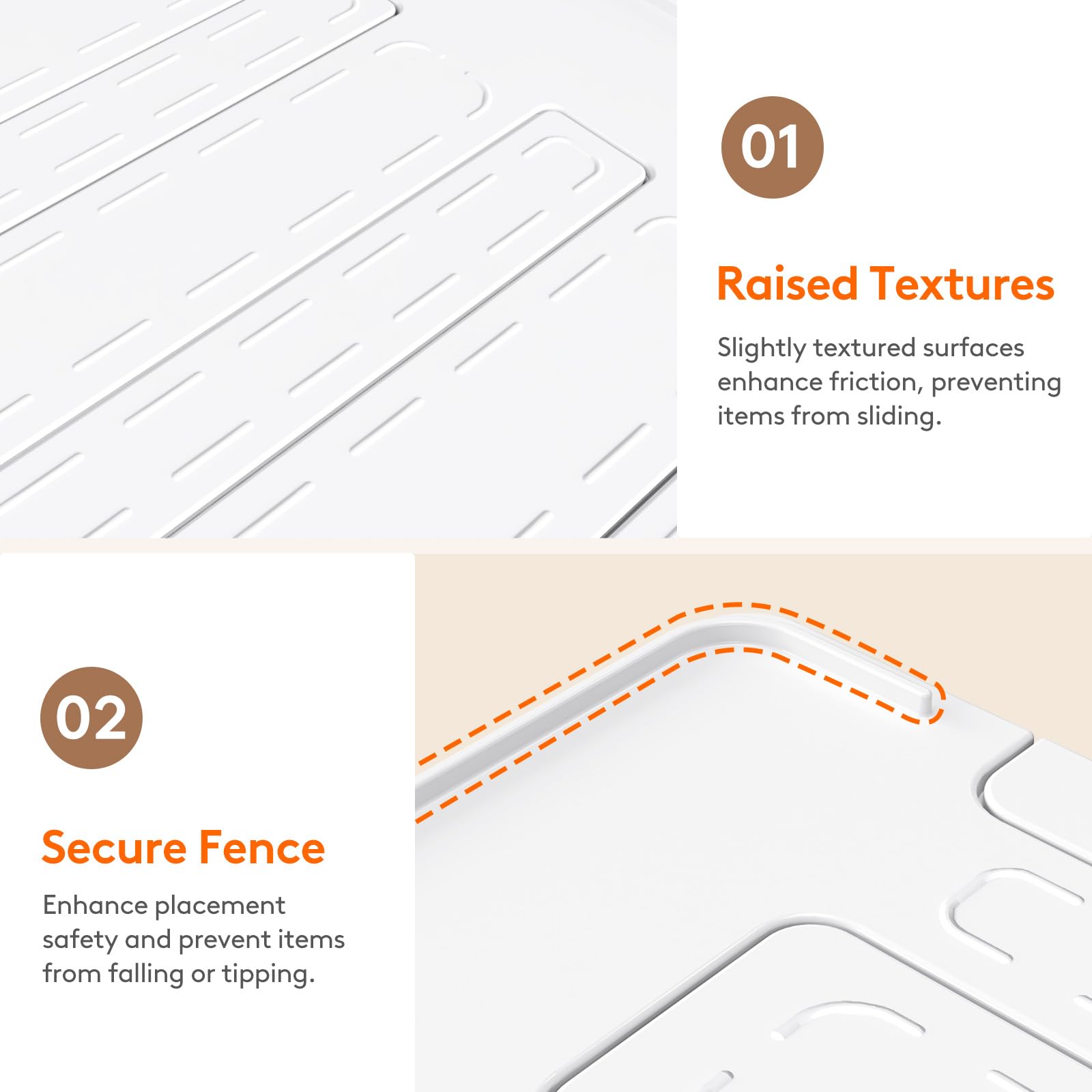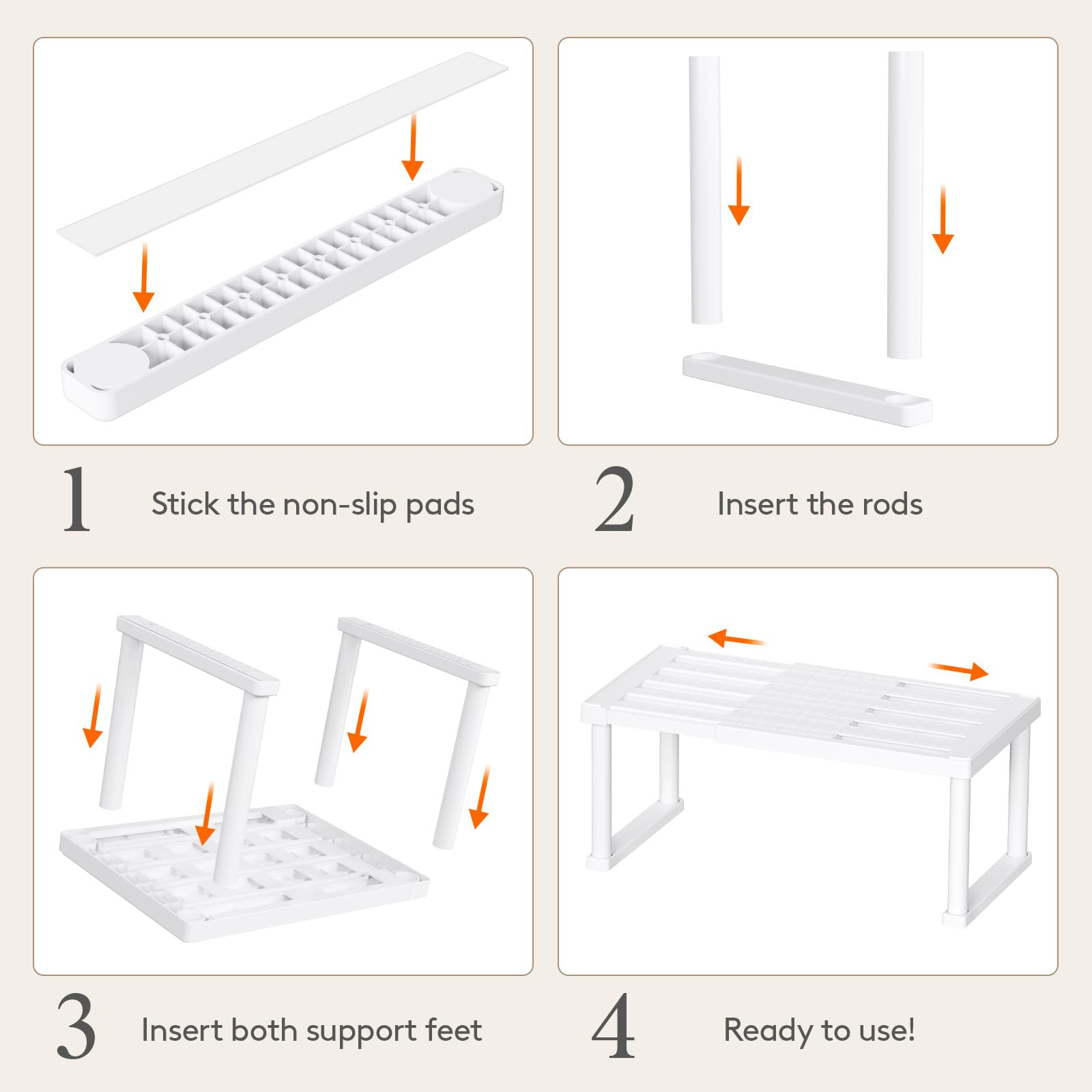 - Anti-Slip Design: Equipped with soft pads at the bottom, this kitchen counter shelf provides a non-slip surface that protects your cabinets or pantry shelves from damage while keeping your items securely in place