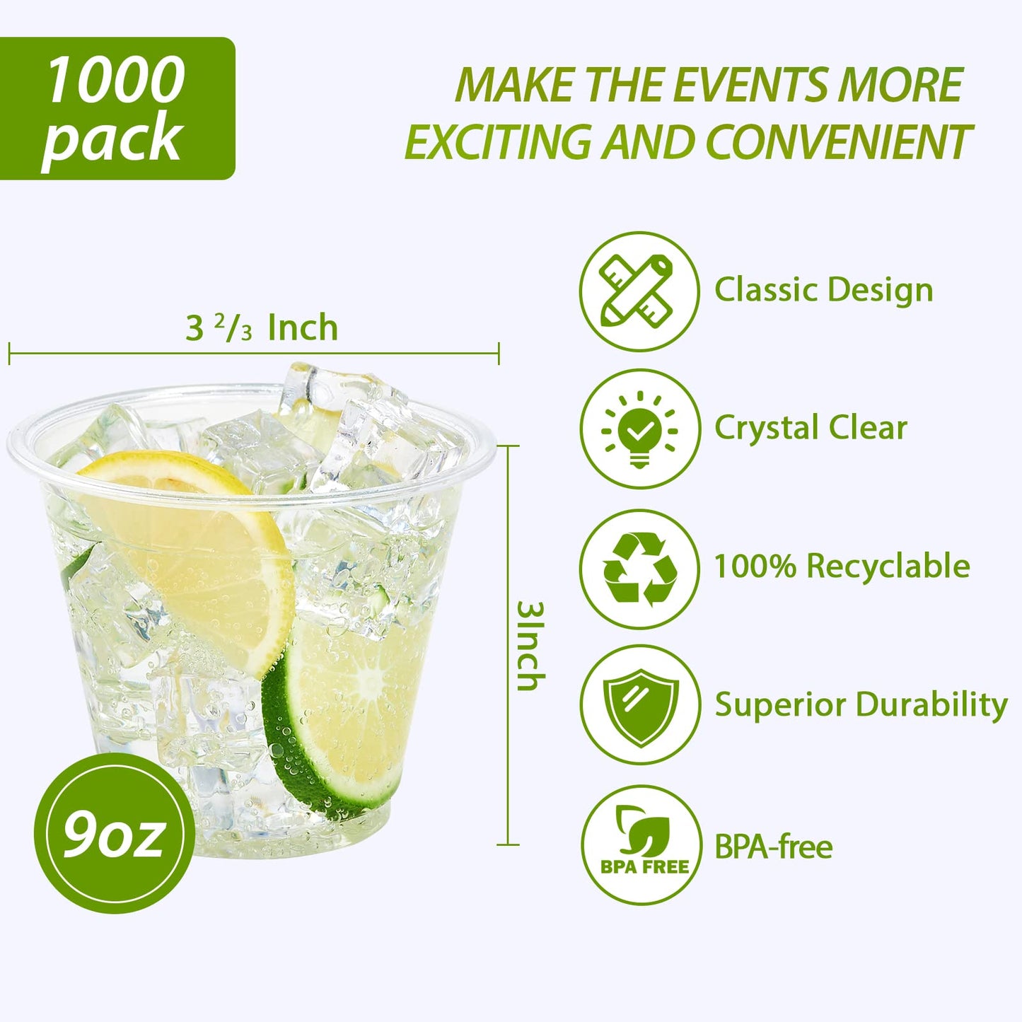 - No-cleaning Need : Each package includes 1000 counts 9 oz clear plastic cups, enough quantity to meet all your requirements. Made of food plastic materials without BPA. Disposable and Durable, so there's no need to clean-up after the events