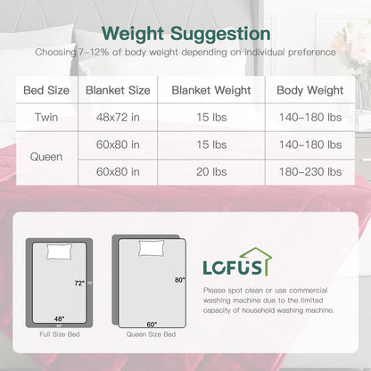 - Select Your Blanket: It is scientifically suggested that weight of the heavy blanket should be 10% of your body weight plus 1lb. Please refer to our size chart for precise selection. Comes with several sizes (48”x72” for twin/full size, 60”x80” for full/queen size), our weighted blanket can accompany you whether you are unwinding Indoor or camping outdoor.