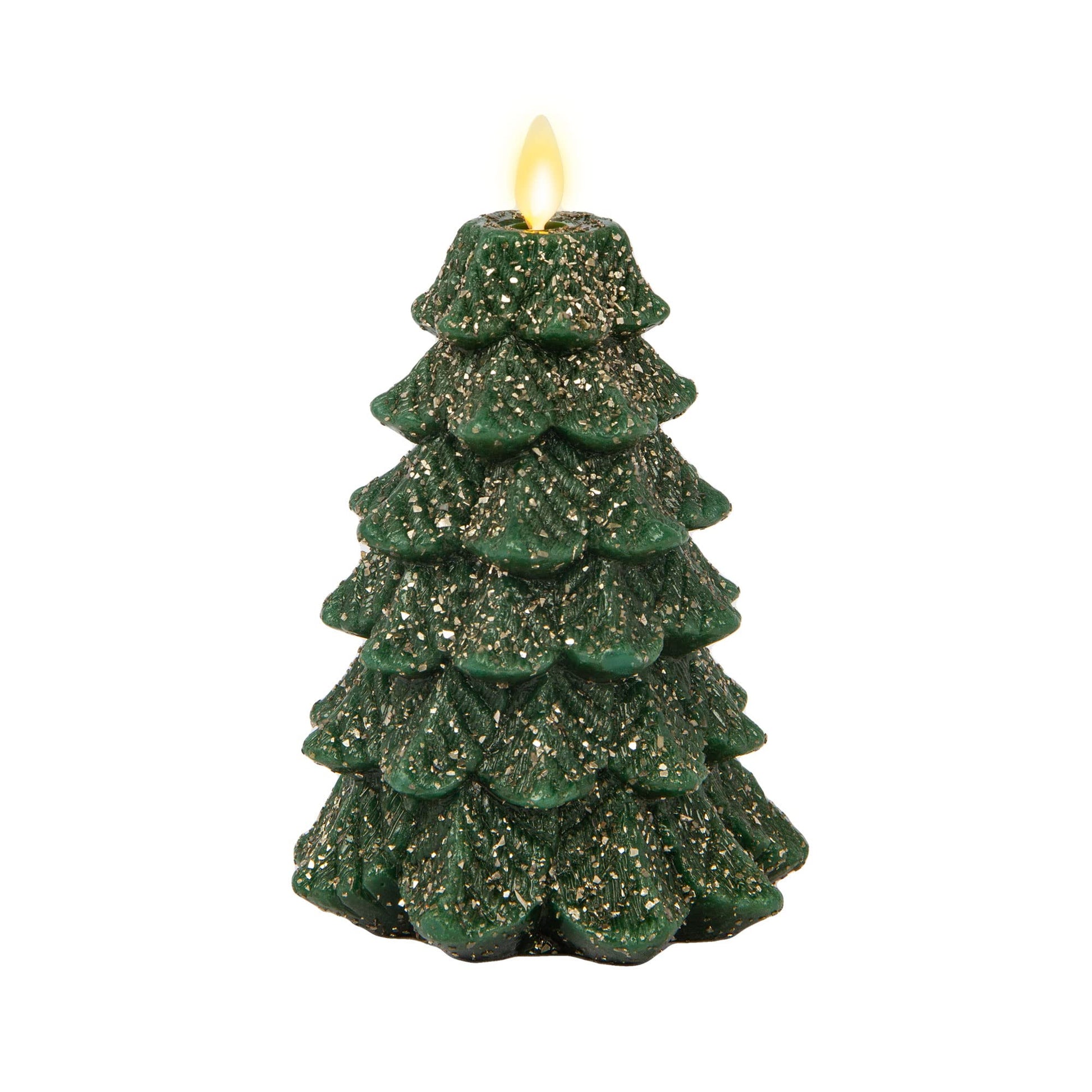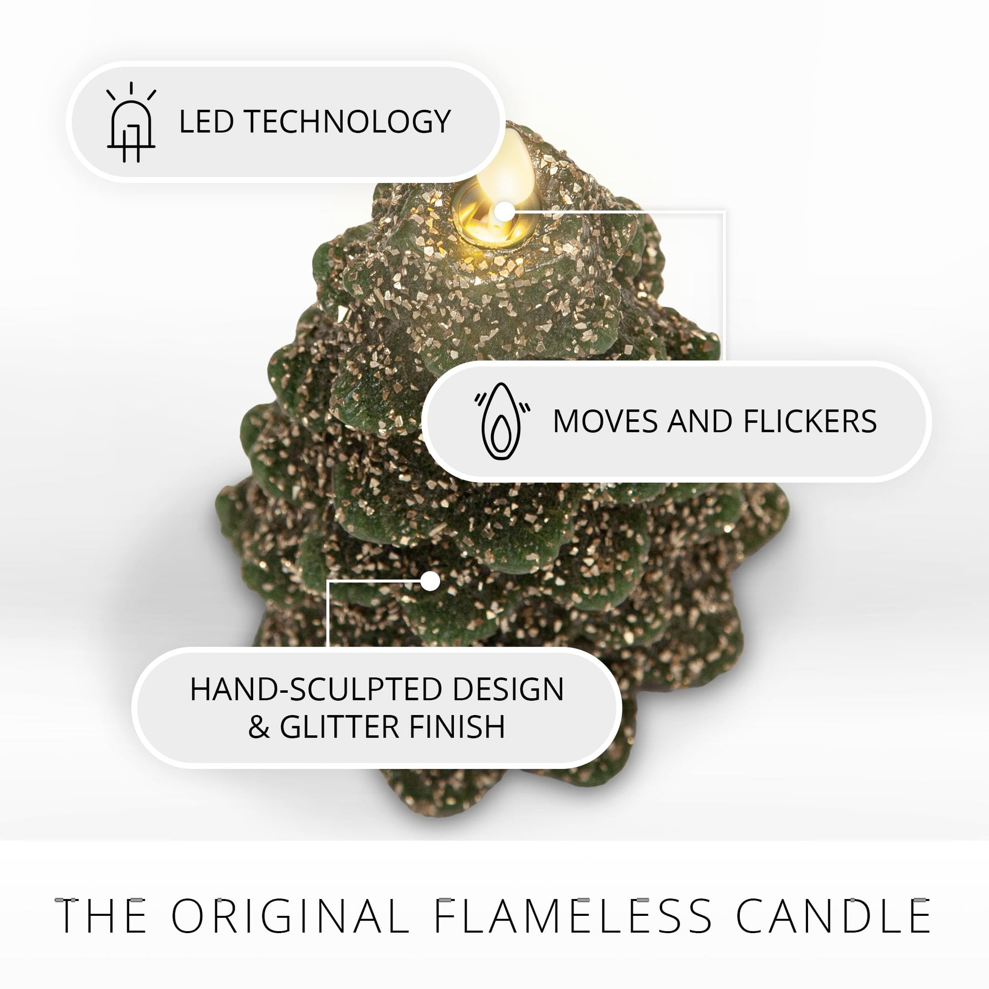 - Holiday Elegance - Turn your home into a winter wonderland with Luminara Christmas Tree Flameless Candles. Covered in real wax with a glitter and snow finish, these artistic iceberg green LED candles resemble the calm beauty of snow-covered pine trees. Perfect for holiday decor, they emit a soft, flickering glow, making them ideal for mantels, table centerpieces, or festive Christmas lights displays. Bring warmth and charm to your seasonal celebrations.