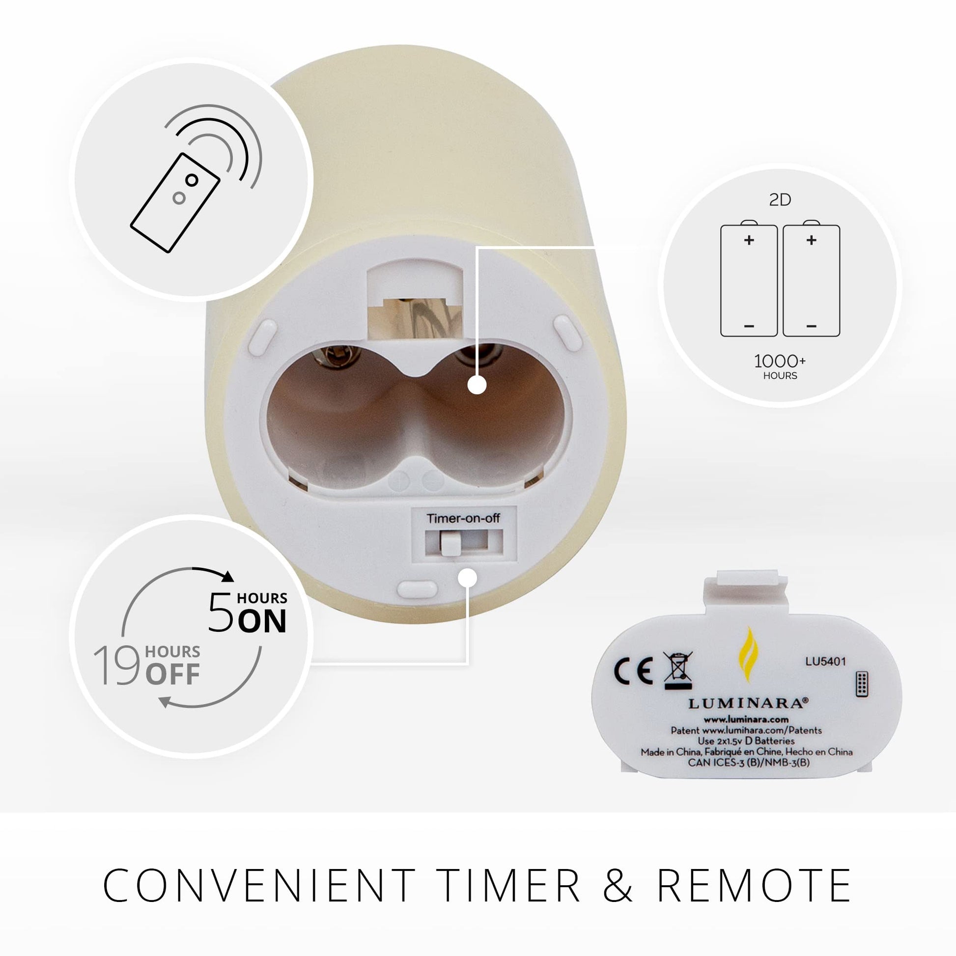 - Each candle takes 2 D Batteries (purchase separately). When using the timer function, the candle will light up for 5 hours, and then automatically shut off for 19 hours. Candles can provide up to 1000 hours of runtime before needing to replace the batteries. With proper care, these flameless candles will provide years of lovely, safe illumination.