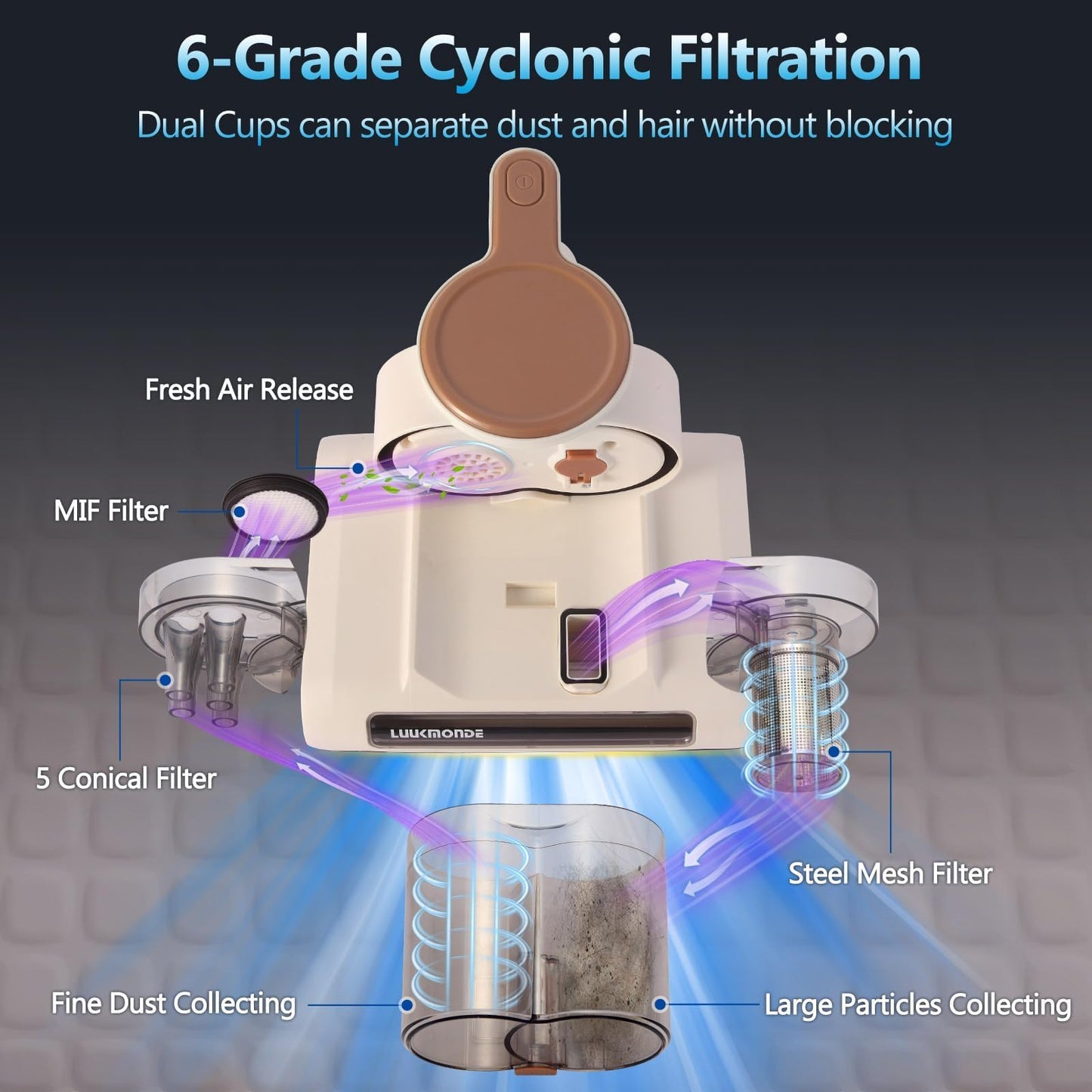 - 【Multiple Cyclone Filtration】Upgraded double cup with five-cone cyclone filtration tech can separate dust and hair, less clogging neither tangling. First, high-speed cyclones trap large debris/hair outside the fine steel filter. Secondly, five-cone cyclone filter further separates small particles. Finally, high efficient MIF filter cotton can filter 99.99% particles as tiny as 0.3 micrometers. 1 more spare filter is included, which is washable and reusable