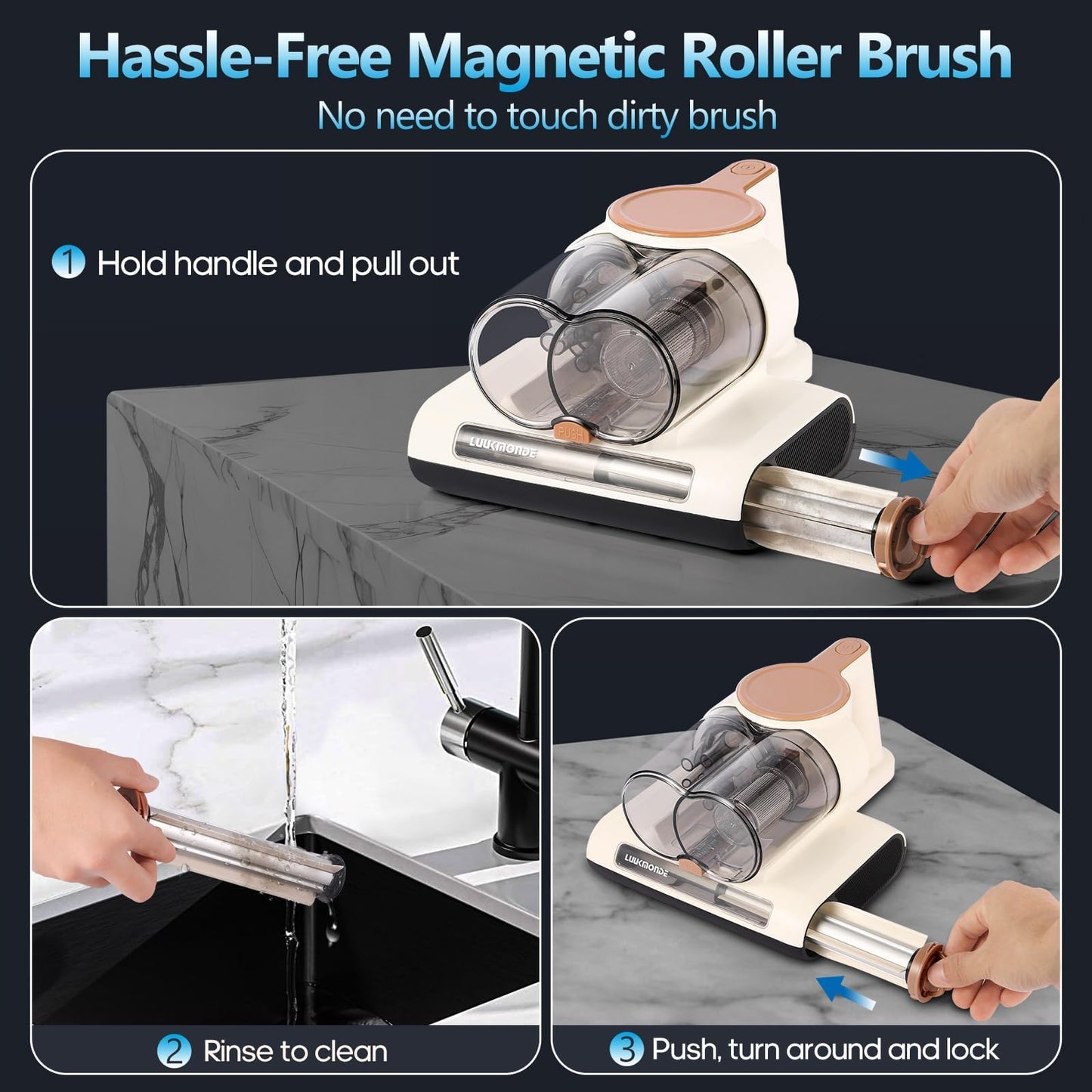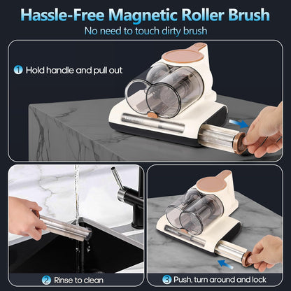 - 【Magnet Tapping Roller】This Mattress vacuum equipped with patented magnet roller brush, NO NEED to touch dirty brush and extremely easy to remove. High frequency 40000 rpm/ min tapping roller brush allows the bed cleaner effortlessly removes dust and debris from mattress. Simply press "PUSH" button and lift up the cup to detach the cups for fast cleaning. Note: Keep"PUSH" button pushed back before putting dust cup downwards on machine