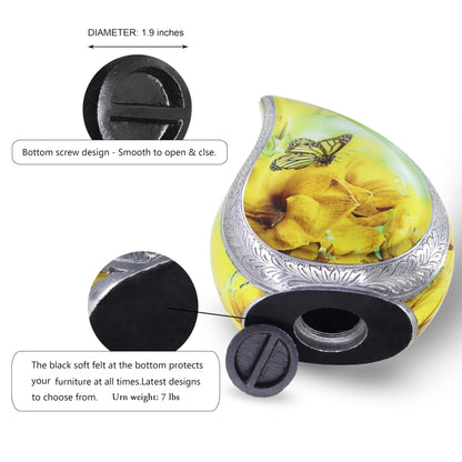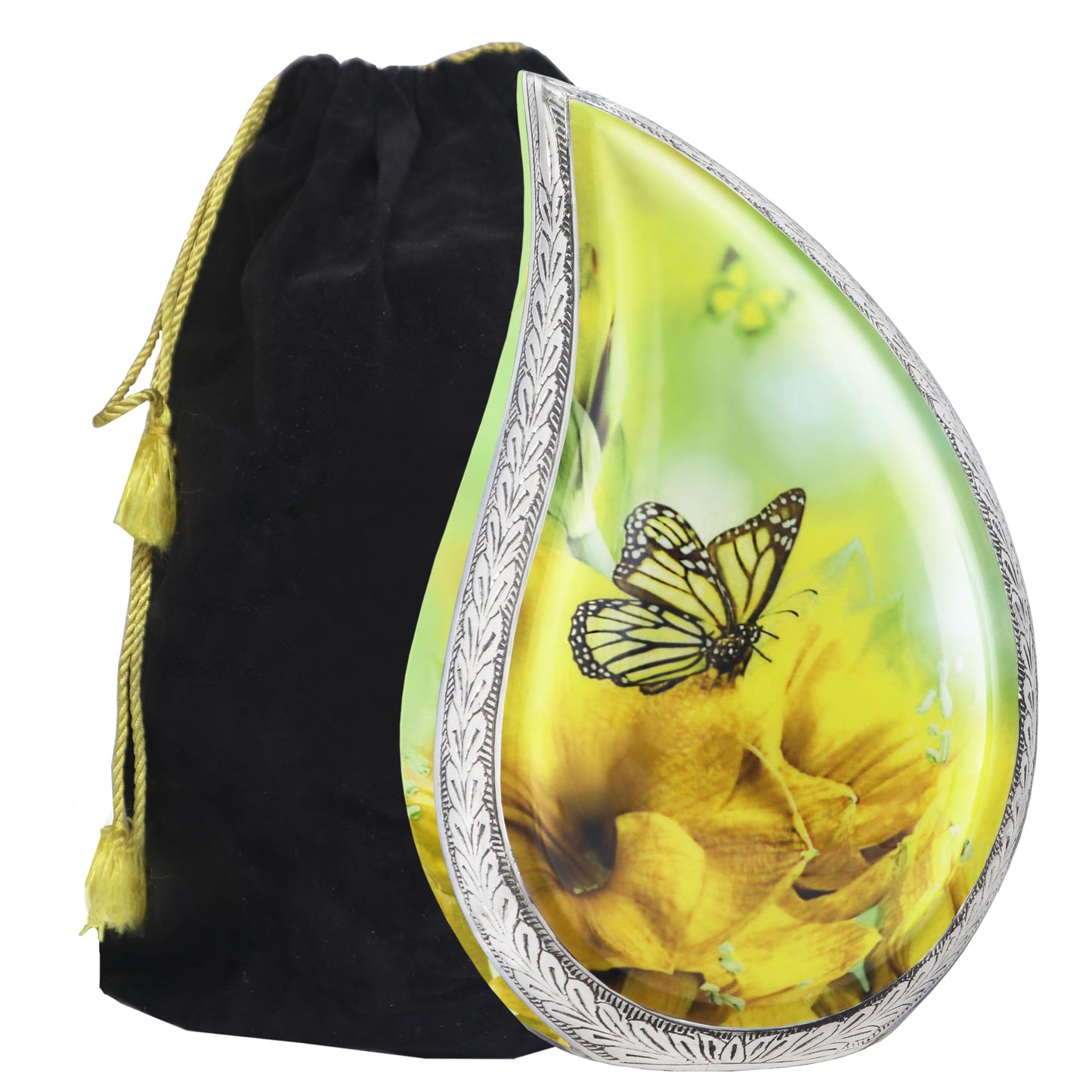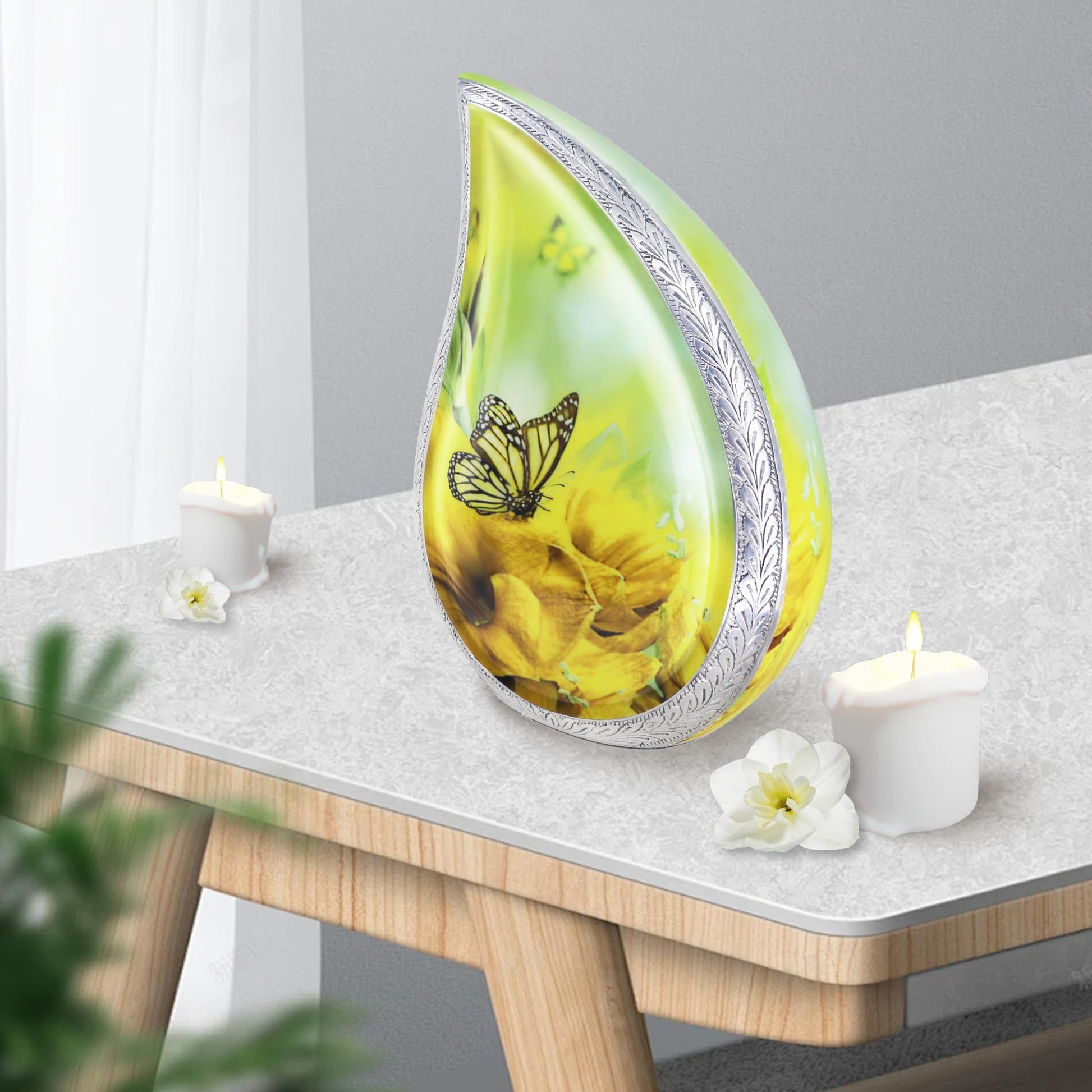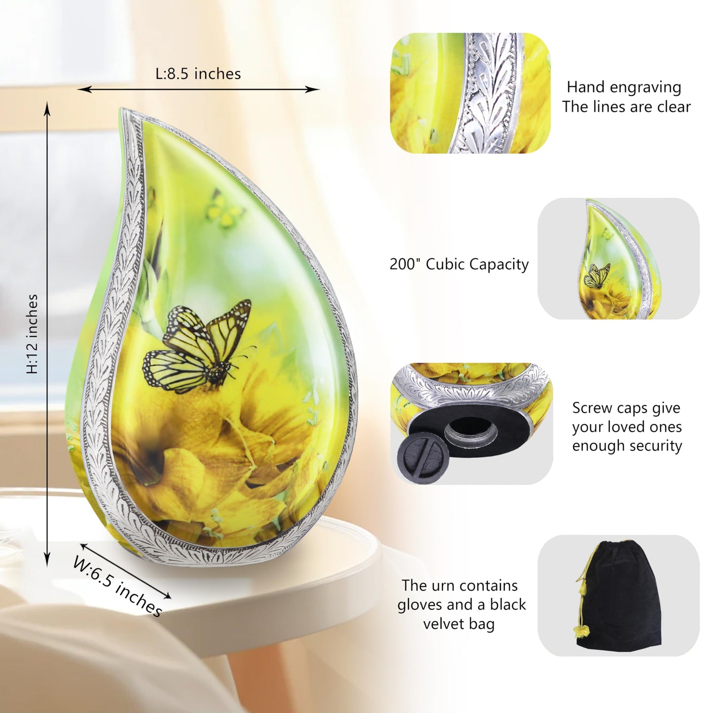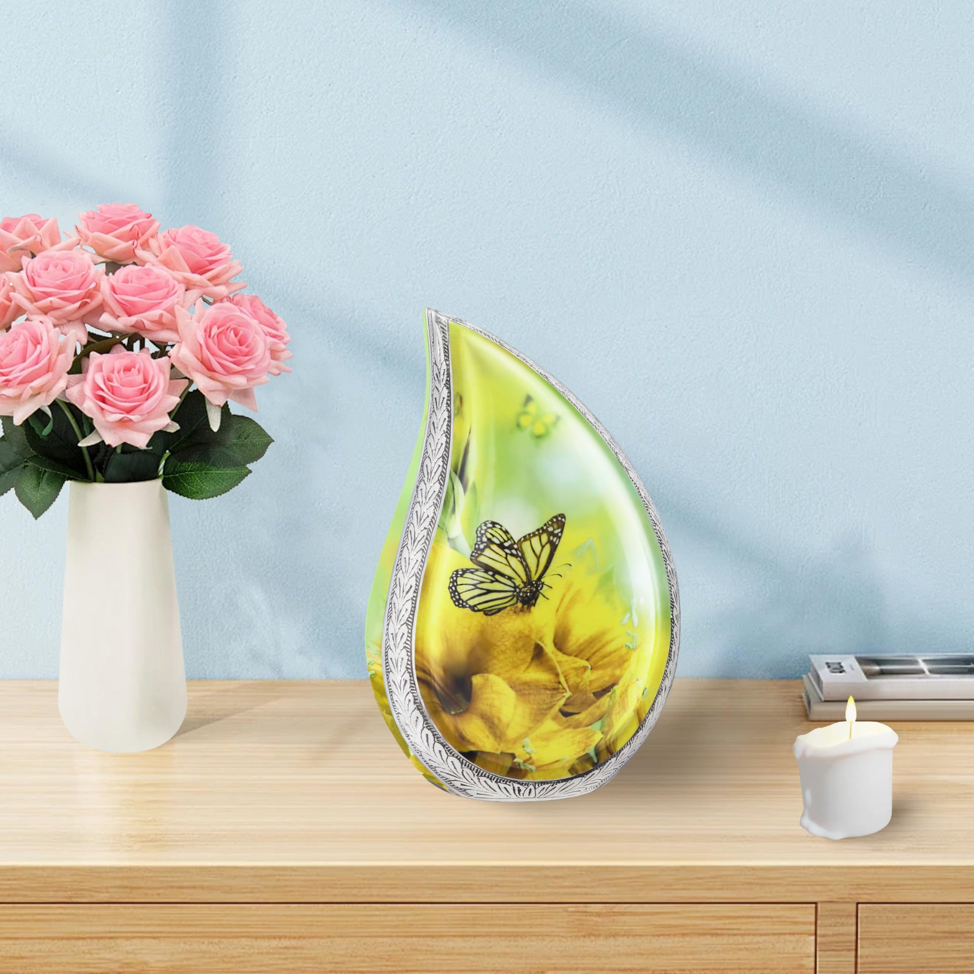 M MEILINXU Cremation Urns for Human Ashes Adult Female & Male, Urn for Ashes for Women & Man, Funeral Decorative Teardrop Urn, Yellow Butterfly and Flower, Large Tear Drop - Full Size