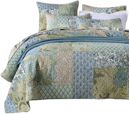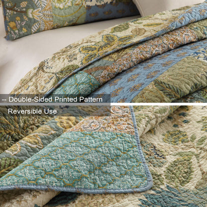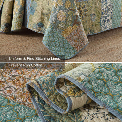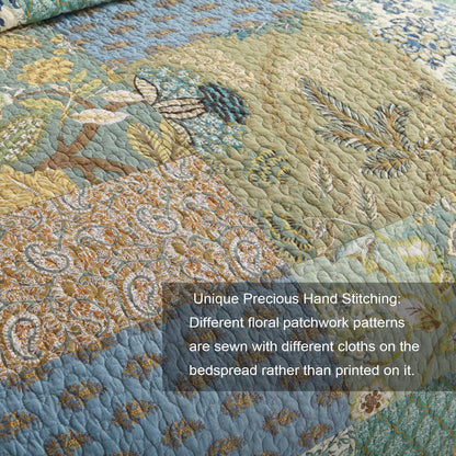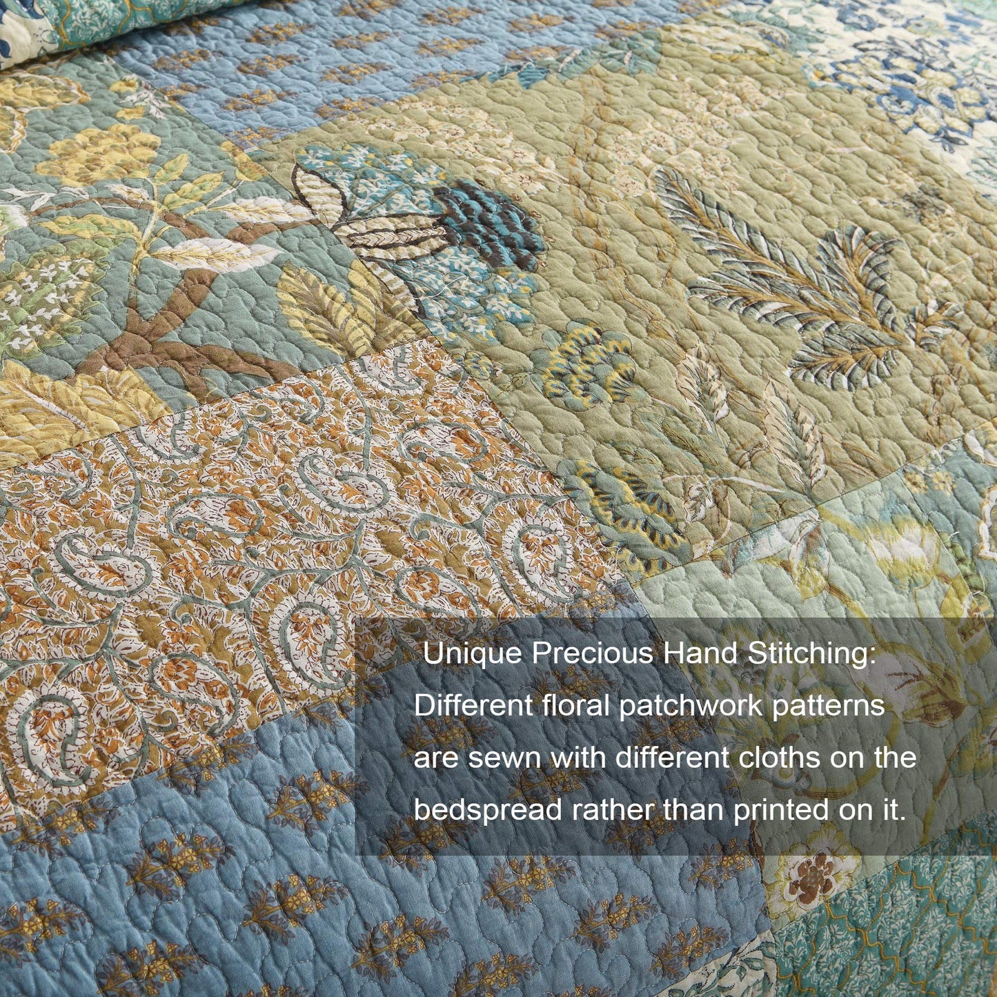 MaiuFun Cotton Bedspread Quilt Sets King Size, Reversible Bohemian Floral Patchwork with Real Stitched Plaid Patterns, 3-Piece Bedding Coverlet for All Season (1 Quilt + 2 Pillow Shams)
