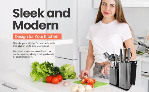 - * Complete set: This knife set includes a variety of knives, such as a chef's knife, bread knife, utility knife, paring knife, and more. It has everything you need for effortless meal preparation. * Stylish knife block: The sleek and modern knife block not only keeps your knives organized but also adds a touch of sophistication to your kitchen decor. The compact design takes up minimal counter space.