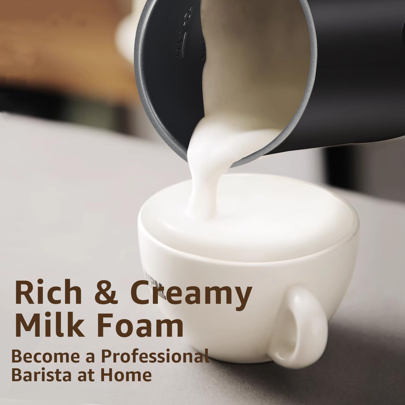 - 4-in-1 Multifunctional Design: Whether you're a coffee novice or an experienced barista, you can easily use our milk frother to heat up milk, create dense hot foam, cold foam, or delicious hot chocolate milk all with one button. Enjoy the perfect blend of coffee and milk at home