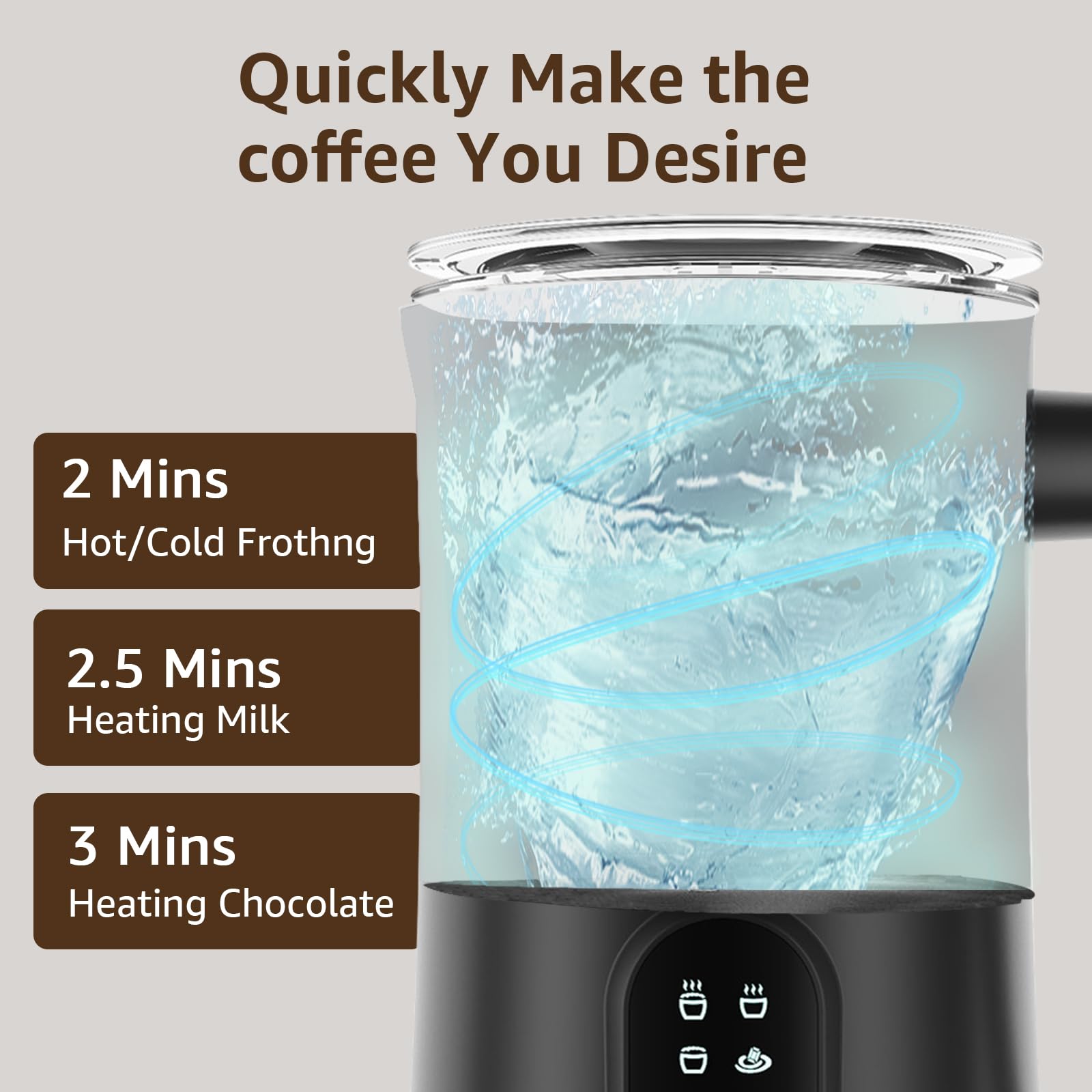- Quick Heating: Our milk frother heats milk to an ideal 140°F-149°F in 2-3 minutes. The right temperature retains the nutritional value of the milk and enhances its flavor and texture