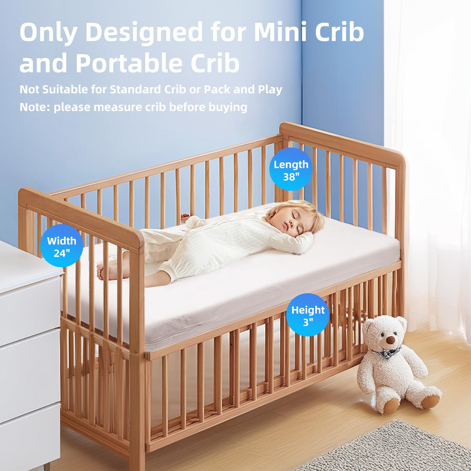 - Only Design for Mini and Portable Cribs: This baby and toddler mattress dimensions are 38L x 24W x 3H inches. Round corner design for snug fit in a mini/portable cribs (NOT designed for standard cribs or pack and plays), please measure your crib before buying.