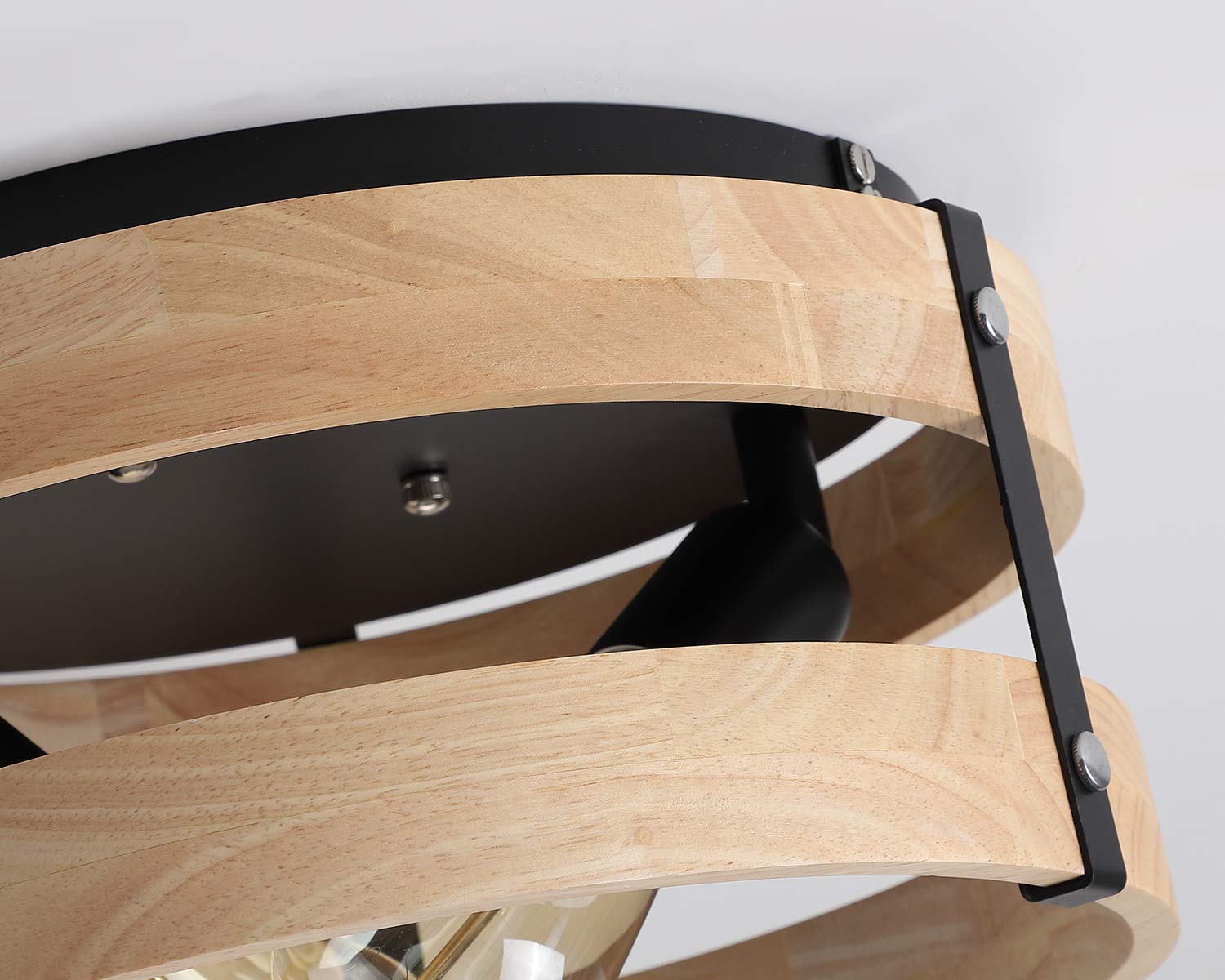 Modern Farmhouse Flush Mount Light Fixture Two-Light Metal and Wood Round Drum Rustic Flush Mount Ceiling Light for Hallway Bedroom Kitchen Entryway, Light Yellow Wood and Black