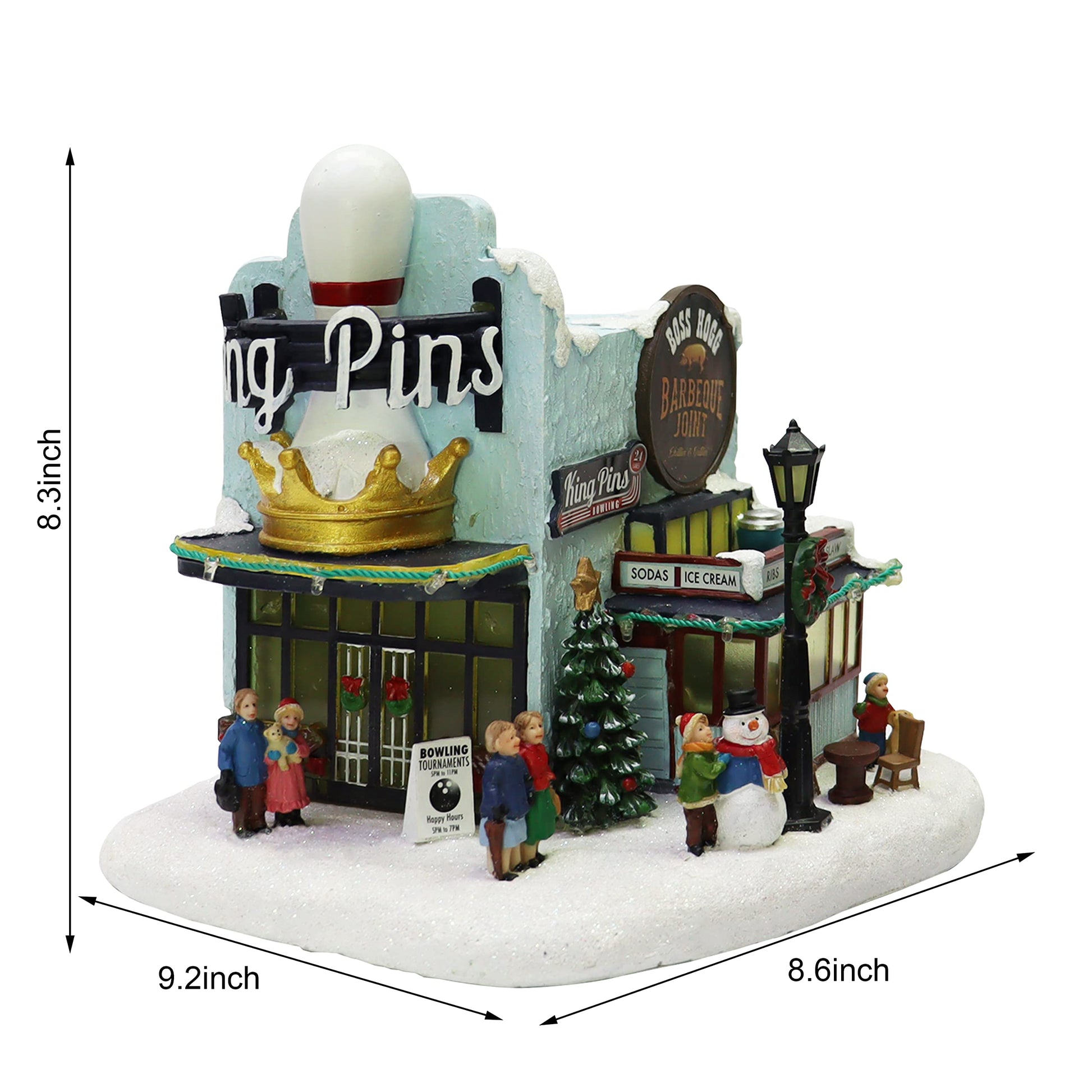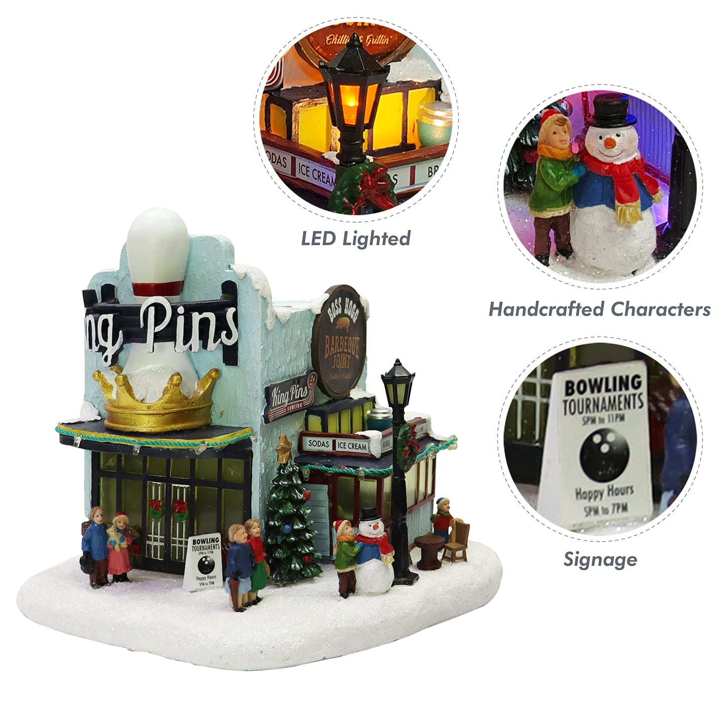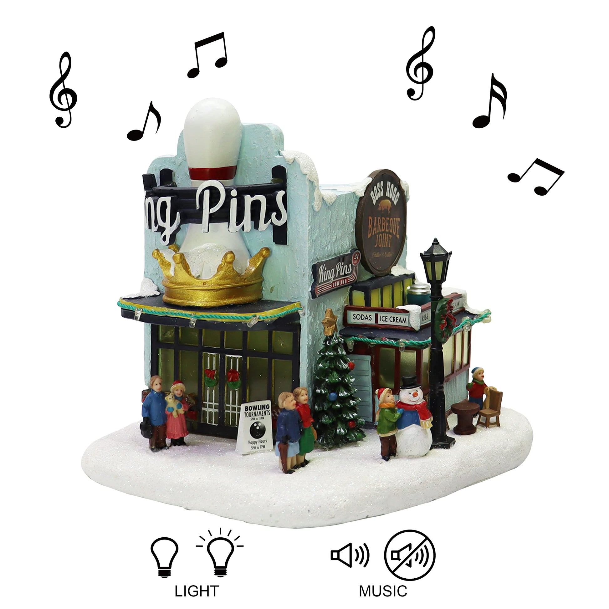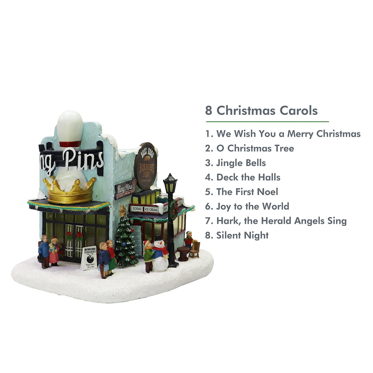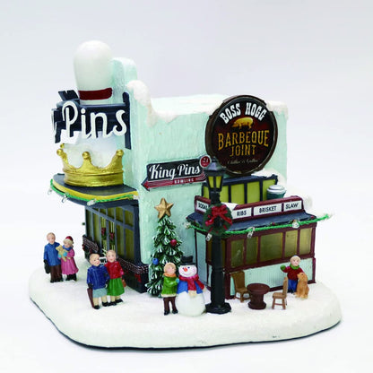 MOMENTS IN TIME Christmas Village Building, King Pins Bowling Alley and Boss Hogg Barbeque Joint with LED Lights and Christmas Music - Battery Operated (not Included) (8.4" H x 9.25" W x 8.6" D)