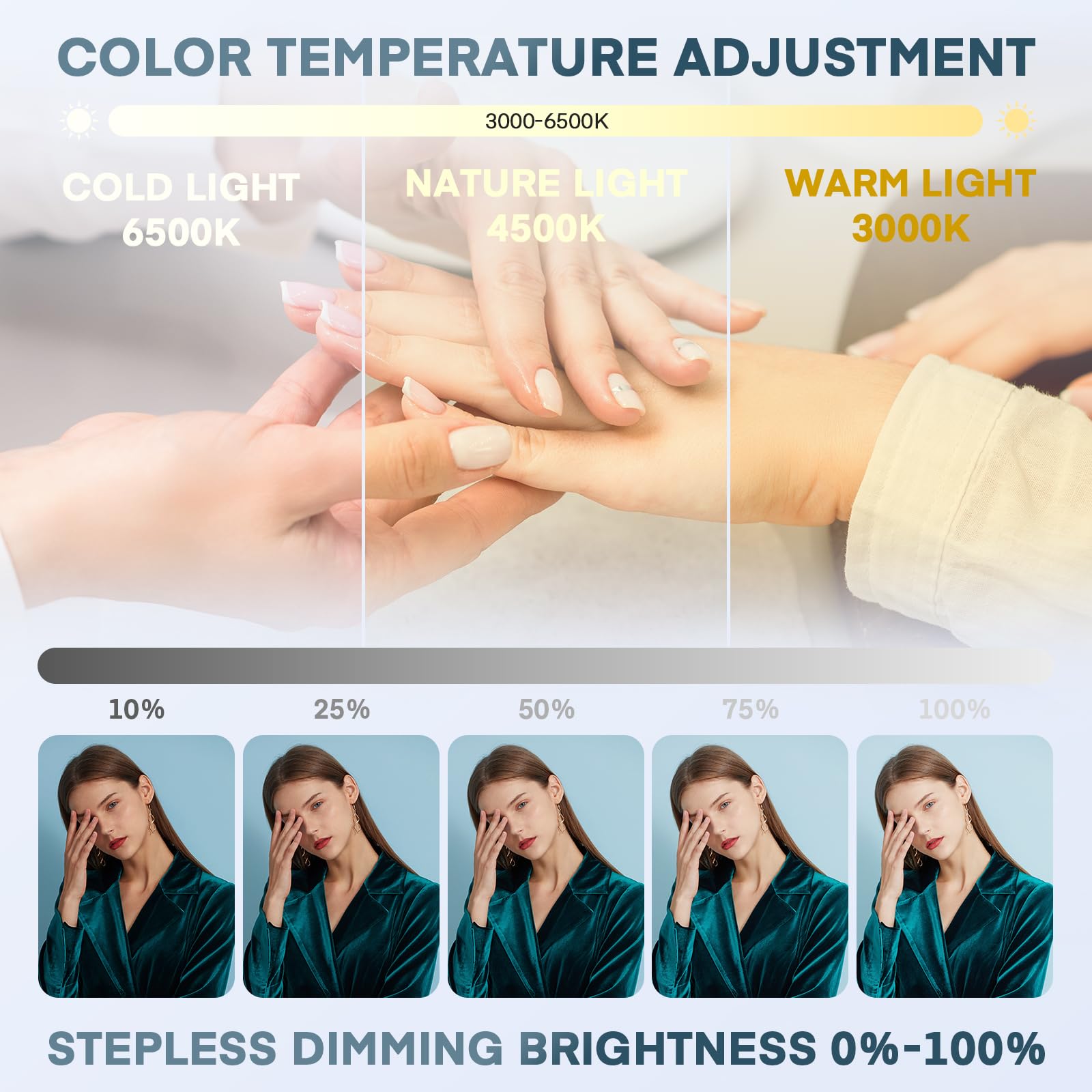 - 【Upgraded Convenient Foldable Design】- Our LED nail light boasts a sleek and space-saving half-moon foldable design that ensures stability without tipping over. The base can be effortlessly attached and detached, only takes 1 second, eliminating the need for complicated screw installation, when not in use, it can be easily removed for added convenience. The tall yet compact arch provides ample space between the lamp and the table, allowing for comfortable customer positioning and easy maneuverability.