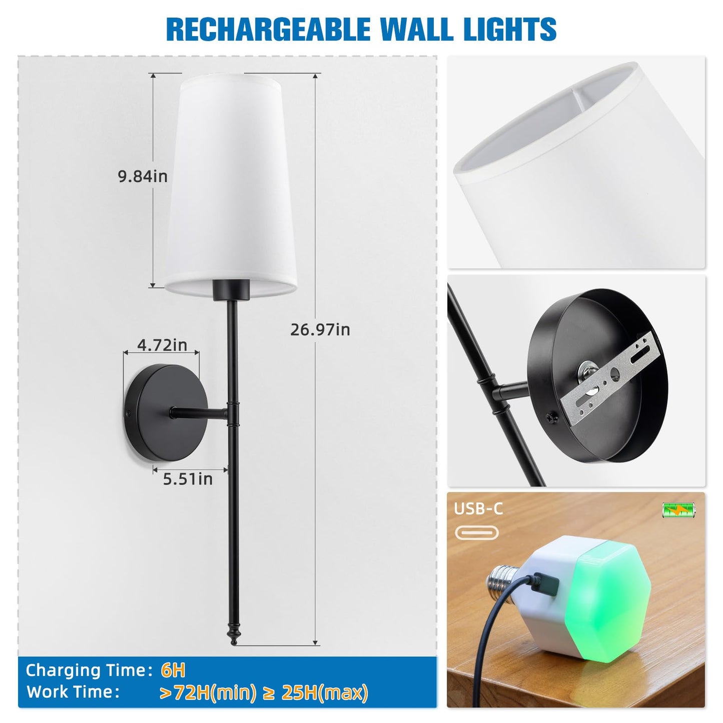 - 【Easy to Install & Wireless】NIORSUN wall sconces set of two battery operated comes with two 300 lumen, 5200 mAh E26 rechargeable bulbs. It can work 25H for highest brightness, 72H for low brightness fully charged.Our rechargeable wall sconce redefine convenience with their easy installation, requiring no drilling or wiring. With a sleek and contemporary design, these sconces effortlessly blend into any indoor space, providing both functionality and style.
