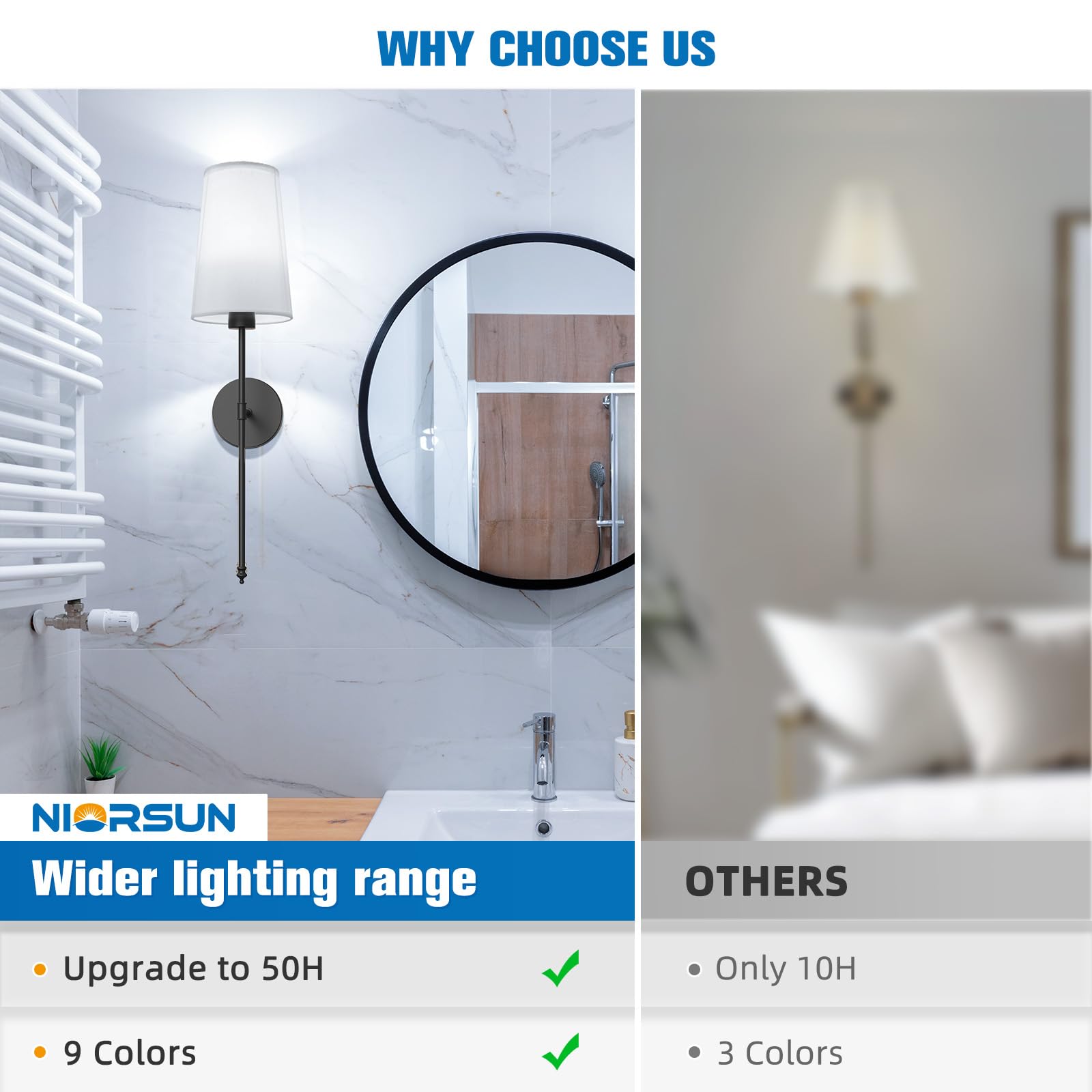 - 【Unique Design & Wide Application】The NIORSUN battery operated wall lamp draws inspiration from classic candelabras, boasting a unique black-finished lamp frame and a white fabric cover. Crafted with premium matte metal materials and impeccable craftsmanship, this lamp epitomizes sophistication and quality,suitable for various spaces including dressing tables, mirror cabinets, bedrooms, hallways, entryways, living rooms, kitchens, and stairs. It's an ideal choice to enhance both the lighting and decor of your home.