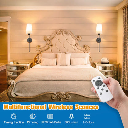 - 【Remote Control & Easy operations】Wireless sconces set of 2 take full control of your lighting experience with the included remote. Easily customize brightness levels and light effects from the comfort of your couch or bed. With just a press of a button, you can create the perfect ambiance for any occasion, whether it's movie night or a cozy evening at home.