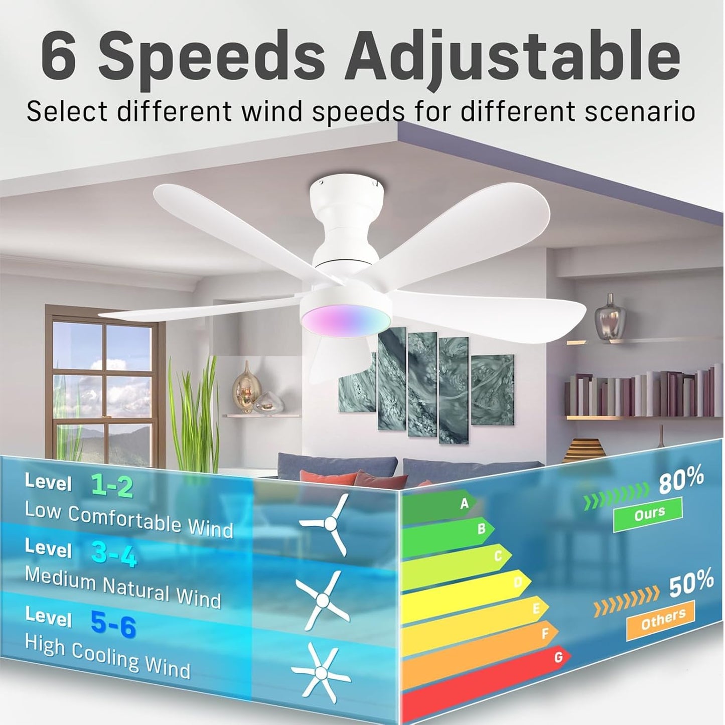 - 【RGB Ceiling Fan with Light】: The 42-inch low profile ceiling fan can be the perfect decoration in your home while providing sufficient airflow and light. Adopting rgb temperature dimming lighting system, it provides an atmosphere for different scenes and adjusts the brightness from 10% to 100% to meet the reading experience.