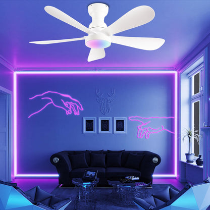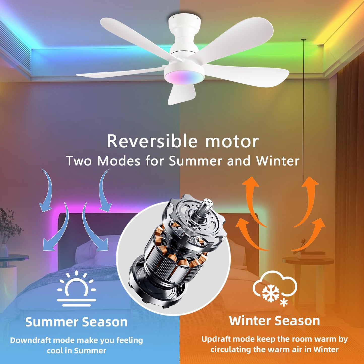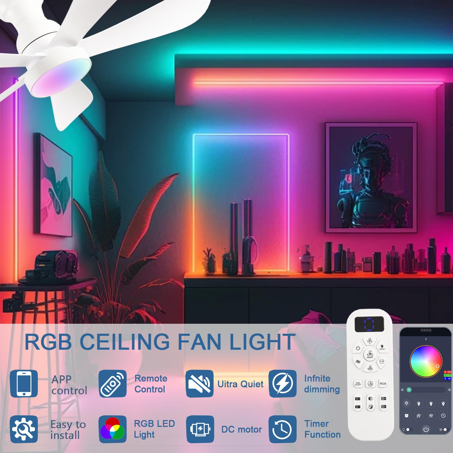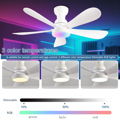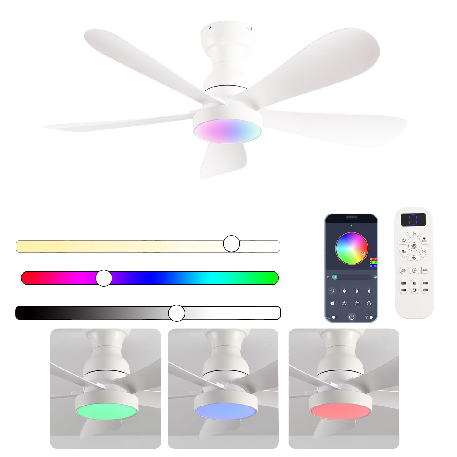 NKPU 42 Inch Ceiling Fans with Lights and Remote/App Control, Flush Mount Ceiling Fan with RGB Dimmable Light, Noiseless Modern White Small Ceiling Fan for Bedroom Indoor/Outdoor