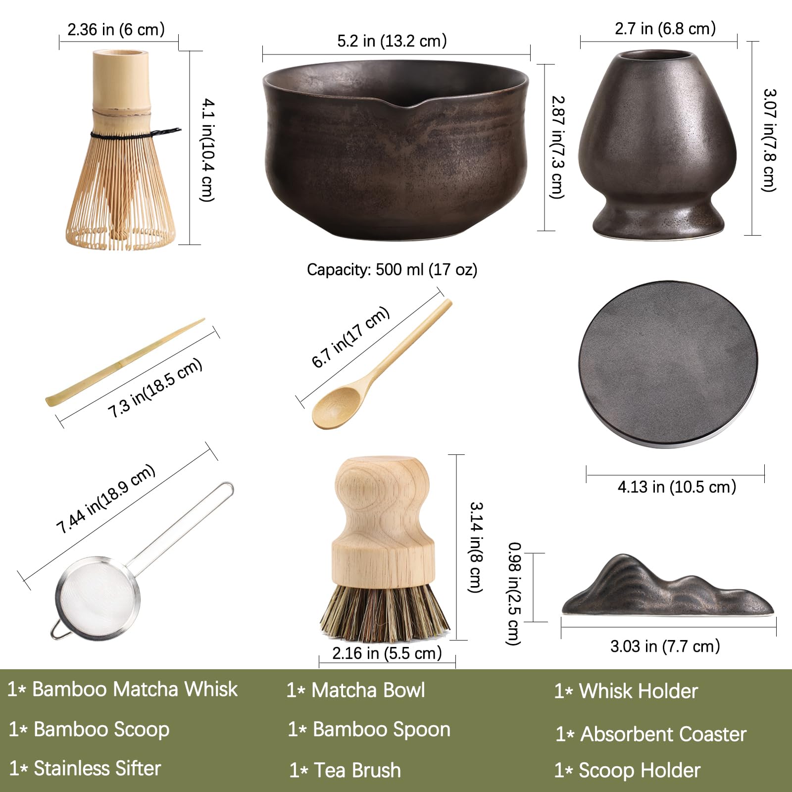 - [Ultimate Matcha Preparation Kit]: This comprehensive set caters to both newcomers and avid fans alike. Included are 17 OZ matcha bowl with spout, bamboo matcha whisk, whisk holder, matcha scoop and spoon, stainless steel sifter, tea towel, ceramic coaster, cleaning brush and scoop holder. Each component is designed to enhance and refine your tea-making process, ensuring every cup of matcha is a masterpiece. This extensive set is the perfect solution for elevating your matcha experience.