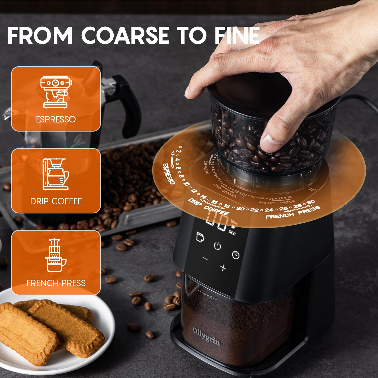 Ollygrin Conical Burr Coffee Grinder Electric Coffee Bean Grinder with Digital Timer 30 Precise Grind Settings Adjustable Burr Mill Grinder for 2-12 Cups Espresso Drip and French Press