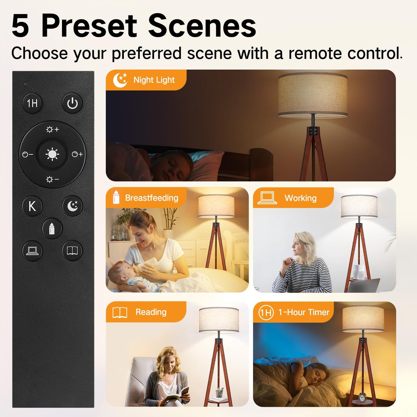 - Different Lights Settings & Memory Function: The wood tripod floor lamp with remote control. It offers 4 color temperatures at warm, warm white, cool white, and daylight, which can come in handy when you want different light for a late evening, or if you are setting the mood for a dinner or event. The standing lamp has a memory function to remember your last setting when you turn the lamp back on. You don't need to cycle through every color temperature to get to the desired setting.