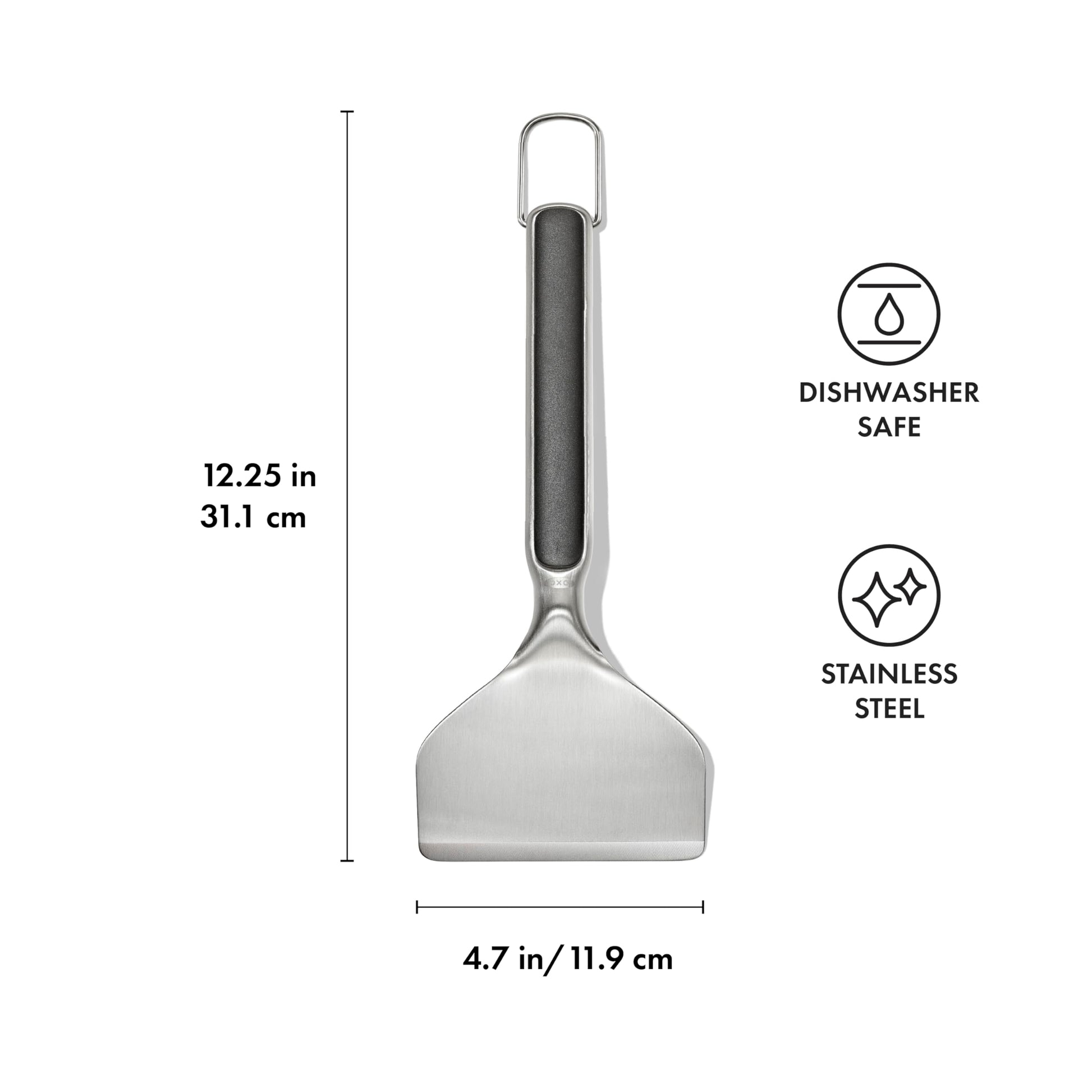 Details: The OXO Good Grips Griddle Scraper allows you to easily remove stuck on food and grease off the griddle. The angled head and handle keep hands away from the heated surface of the griddle. Cleaning your flat top is a breeze– the sharp edge gets into corners and easily scrapes off food and grease from the surface of the griddle. The OXO Griddle Scraper is designed with a comfortable handle and nonslip grip, so you have control while cleaning off your flat top griddle. The scraper tool is also great as a griddle spatula – for chopping meat and vegetables while cooking on the griddle. Store your Griddle Scraper using the hanging ring on the end of the handle. Stainless steel, dishwasher safe.