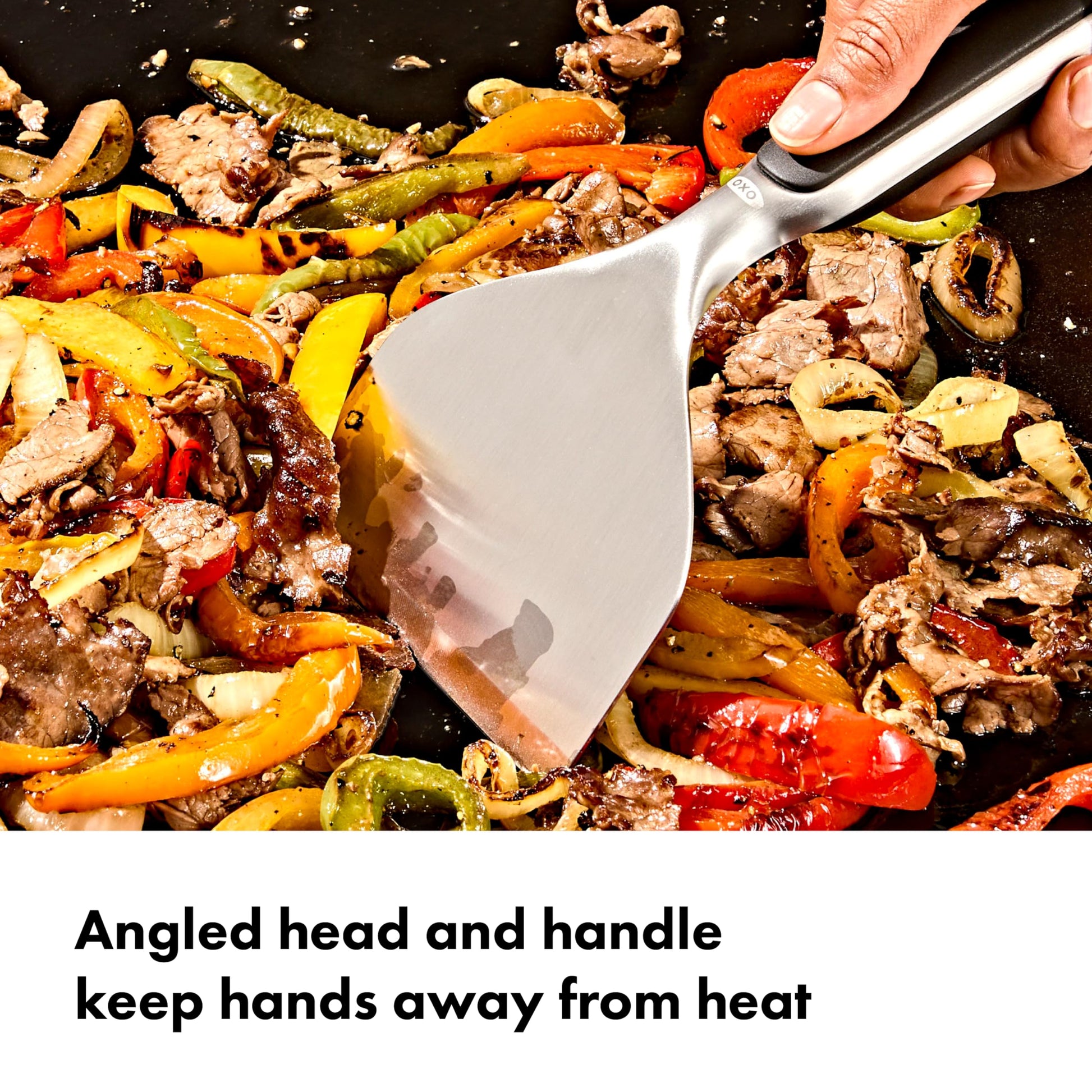 - Angled Head and Handle: Keep hands away from the heated surface of the griddle.