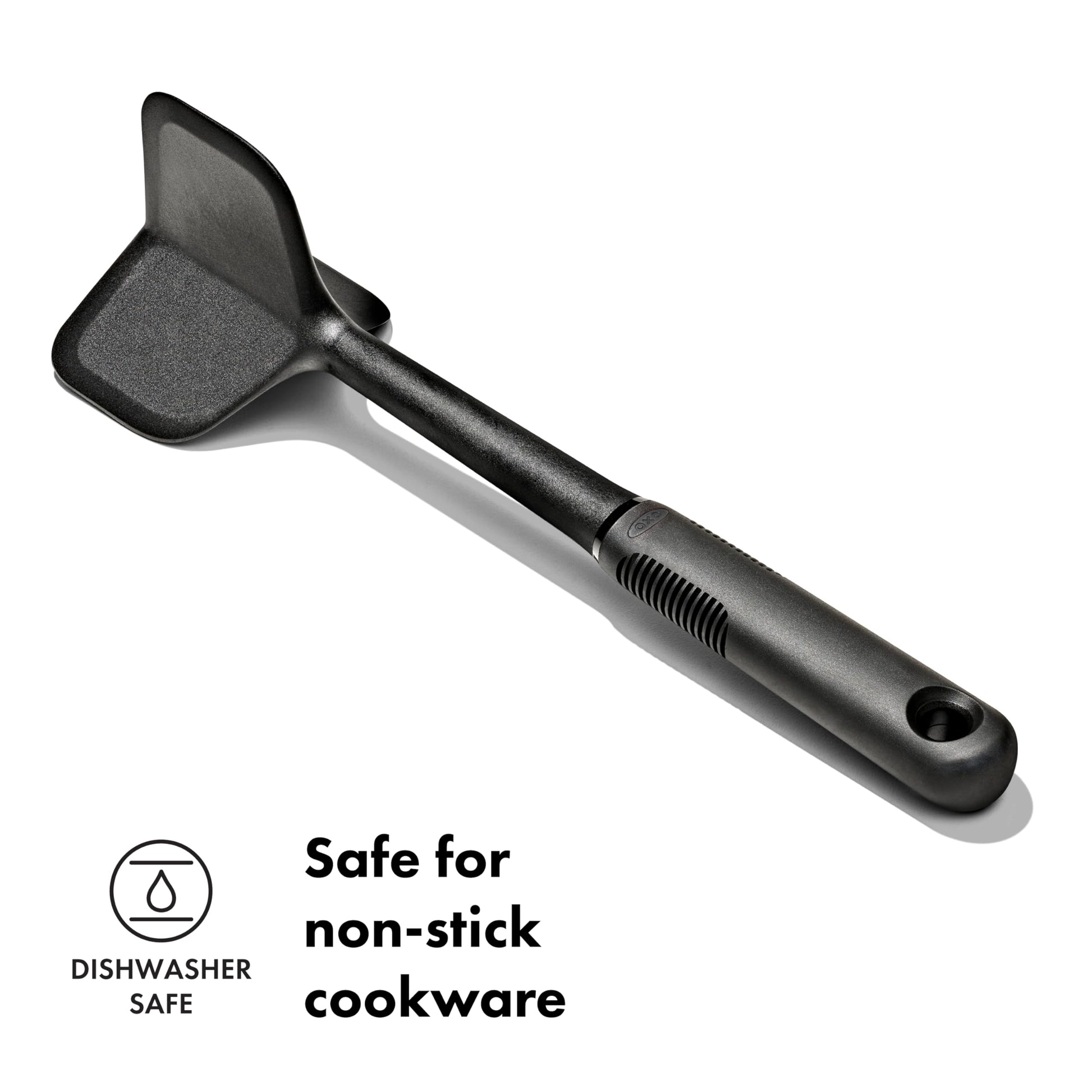 Details: Whether you're making bolognaise sauce or shepherd's pie, cooking ground meat doesn't have to be a chore. The OXO Good Grips Ground Meat Chopper & Turner features three wide blades designed for chopping stirring ground meat while cooking. One blade has a silicone edge that is perfect for scraping pan edges and transferring food out of pans. The rounded shape of the blades allows them to easily reach in corners of pans and the space between the blades helps prevent uncooked meat from getting trapped. The soft, comfortable handle is non-slip for control while cooking, the durable construction is tough enough to break apart partially defrosted meat and the materials are safe for non-stick cookware and dishwasher safe. The Ground Meat Chopper & Turner is also great for frozen juice concentrate, tomato sauce, crumb topping and more!