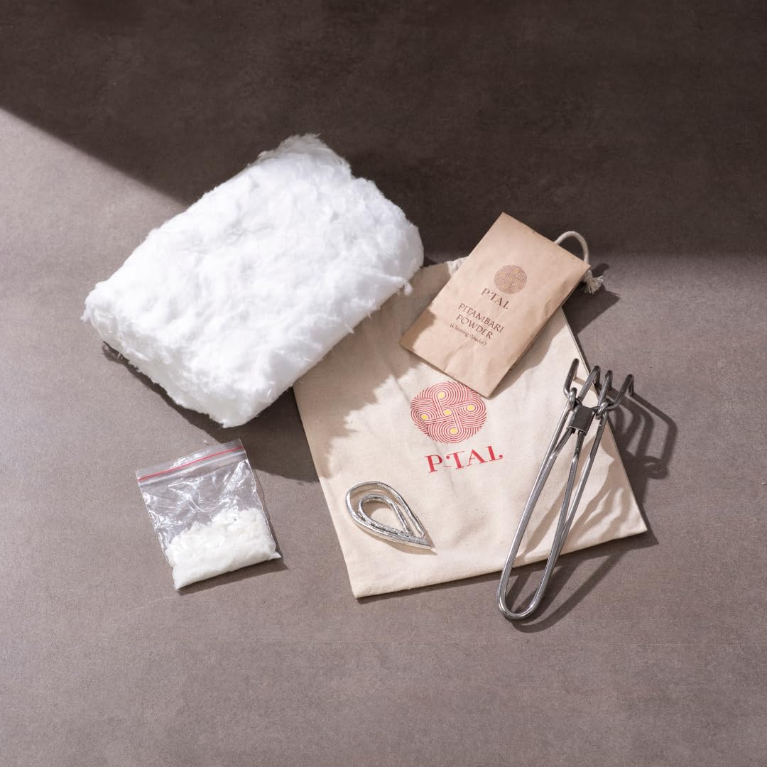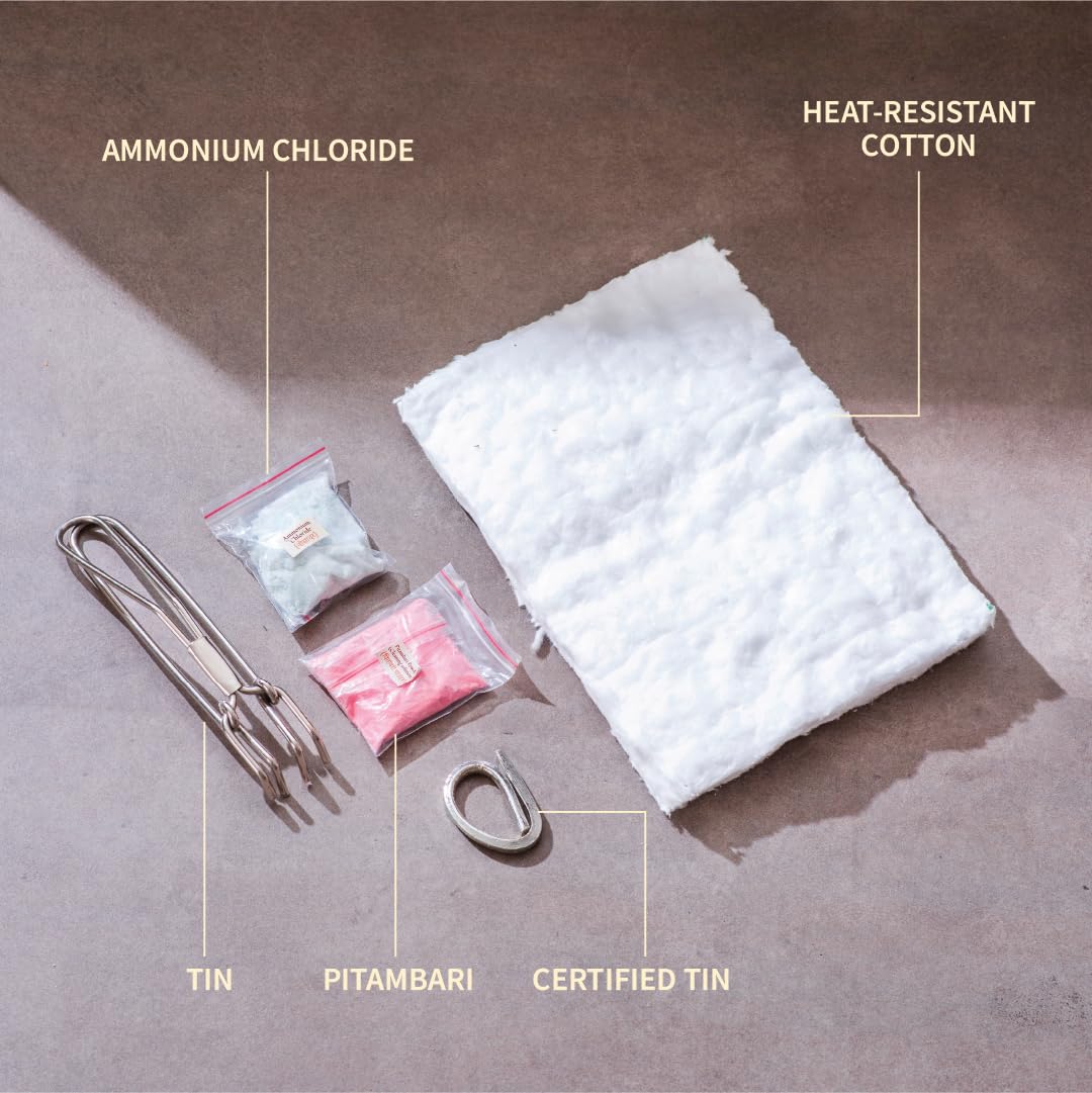 - Included Components: Ammonium Chloride (50 gms),Malaysian Tin (1 Bar of 50 gms), Pitambari Powder (50 gms), Holder or Pakad, Heat Resistant Cotton